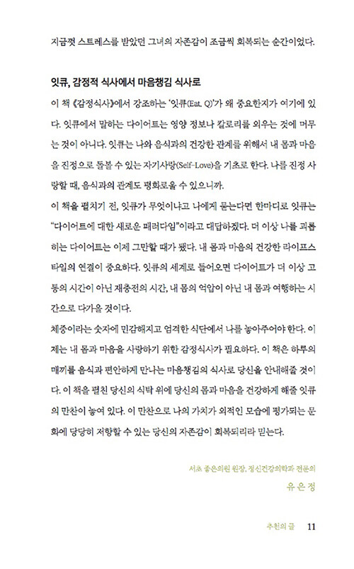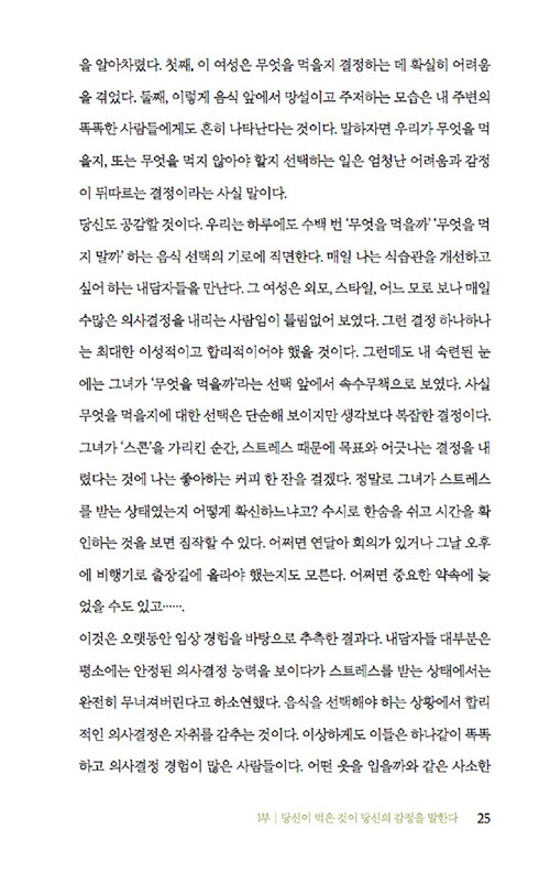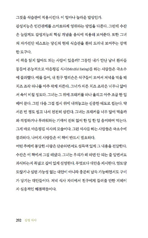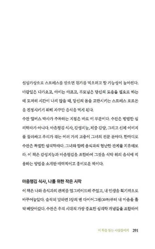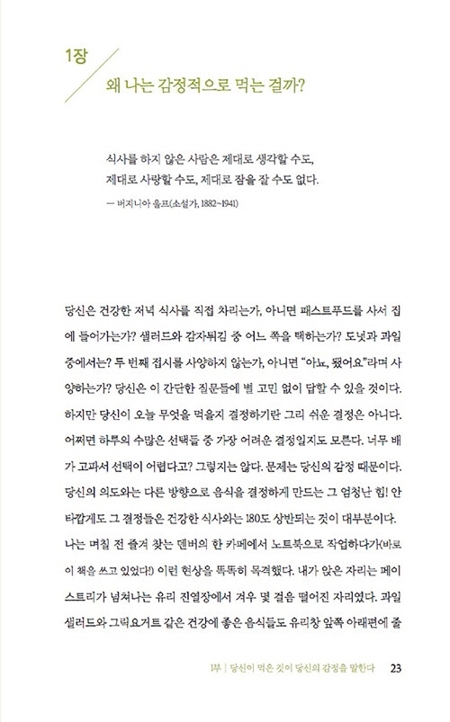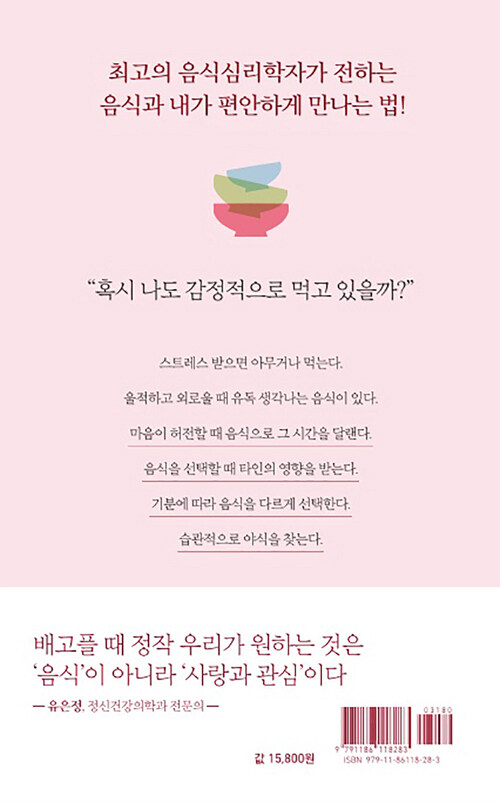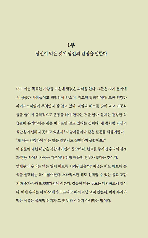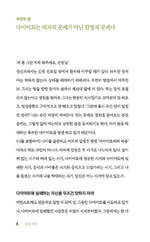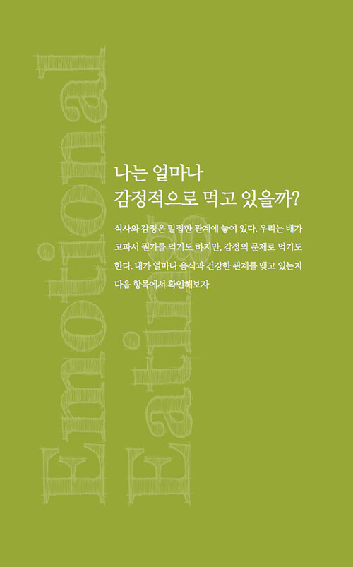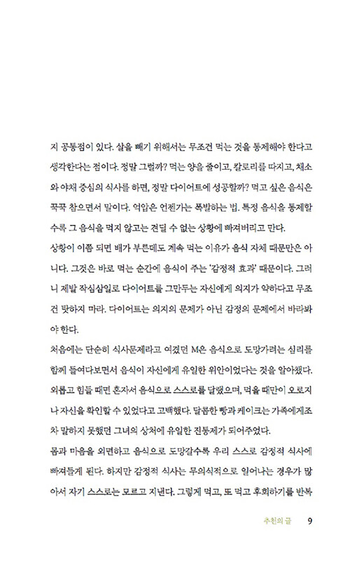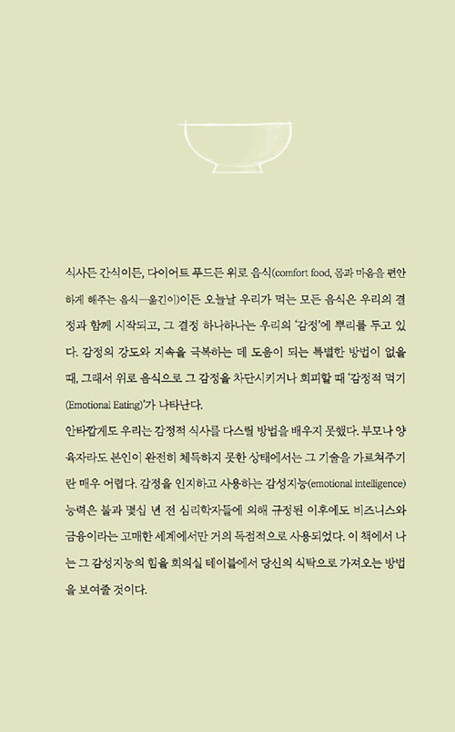 음식과 감정과의 관계에 관한 이 책은 감정이 우리의 음식 선택에 미치는 영향을 심리학적 관점에서 흥미롭게 풀어낸다. 저자는 식사문제를 겪고 있는 수많은 사람들을 상담하면서 이들의 과식이나 폭식 뒤에 숨은 정서적 문제를 발견했다. 처음에는 단순히 다이어트나 식습관 개선을 위해 상담실을 찾았지만, 이들의 식사문제 뒤에는 언제나 정서적 문제가 숨어 있었다고 한다.