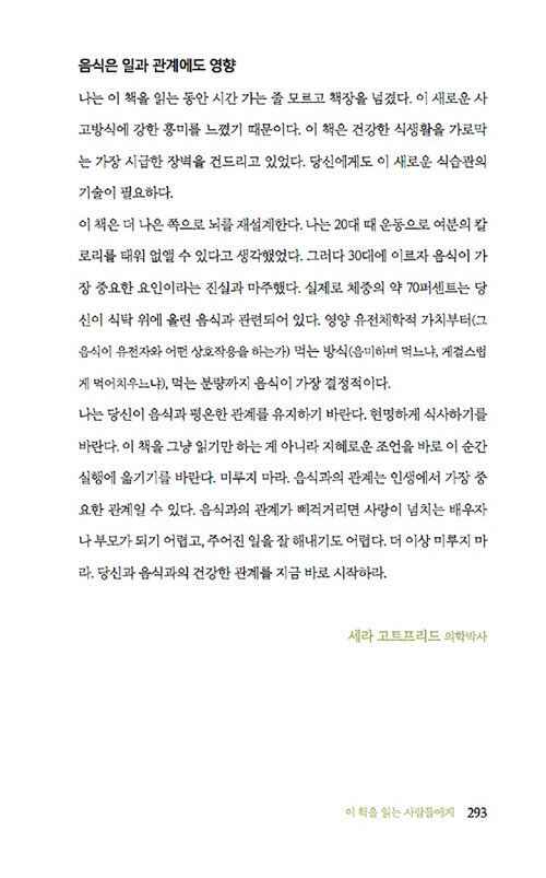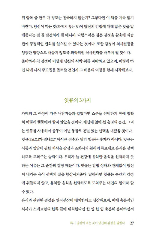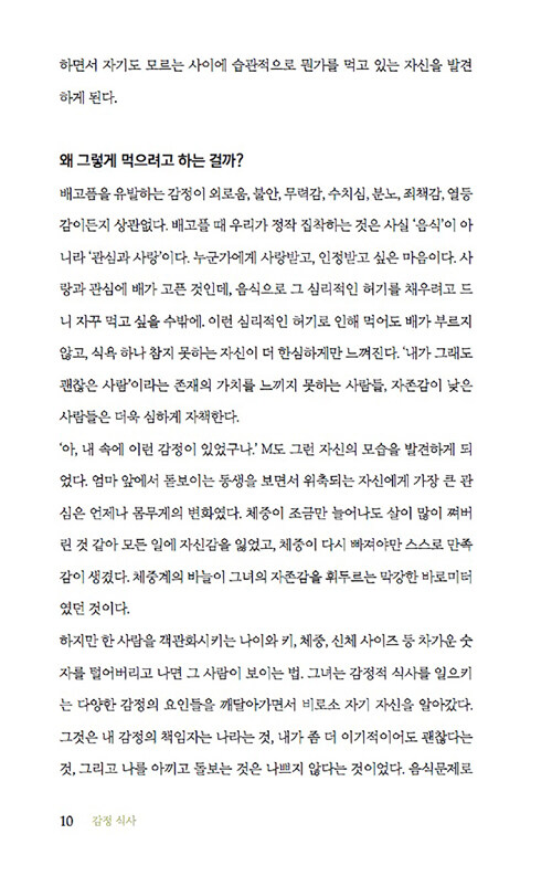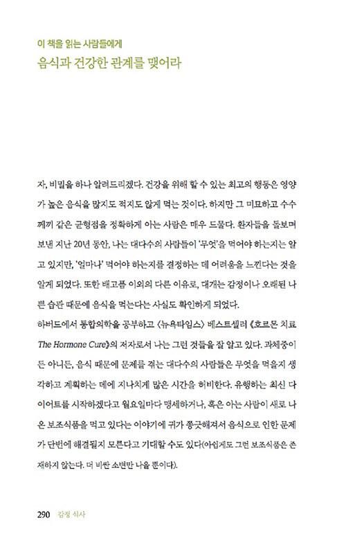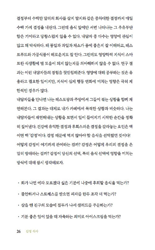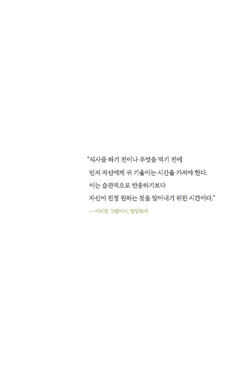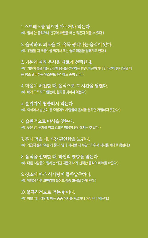정서적 허기, 즉 가짜 배고픔을 조심하라고 말한다. 감정적 식사를 일으키는 스트레스, 트라우마, 사교적 식사, 쾌락의 추구, 다이어트에 대한 강박 등으로 인한 정서적 허기는 육체적 허기와는 달리 ‘가짜 배고픔’을 유발해서 끊임없이 먹을거리를 찾게 만든다는 것이다. 다시 말해 배가 고프지 않은데도, 심리적으로는 배고픔을 느끼는 상태에 빠지는 것이다.