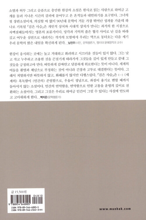 세련되고 충격적인 이미지, 우아하고 힘있는 묘사, 그것들을 하나로 꿰는 견고한 서사를 바탕으로 등단 이후 줄곧 문단과 독자들에게 강렬한 독서 체험을 선사해준 작가 한강의 <검은 사슴>이다.