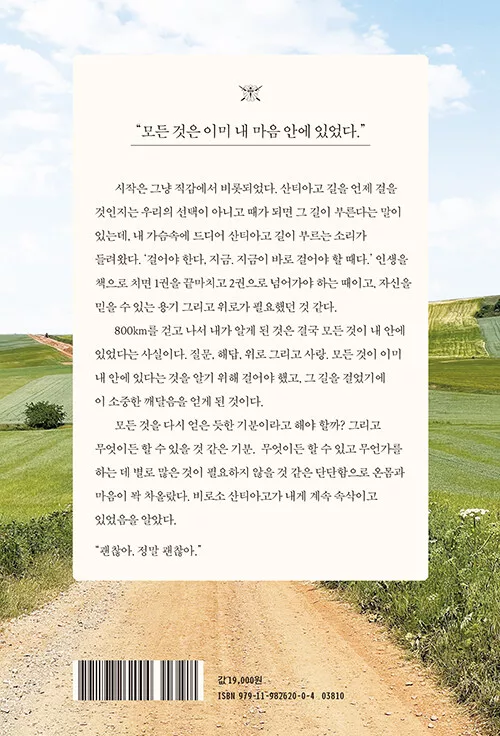 그렇게 2022년 5월 손미나는 800km 산티아고 순례길에 올랐다. 40일간 800km를 걷는 동안 육체의 한계에 부딪혔지만 오히려 정신은 더 선명해졌다. 마음속에서는 끊임없이 생각과 감정들이 피어올랐다. 그동안 밖의 소리만 들었는데 산티아고에서는 자신 안의 소리에 집중할 수 있었다. 그 누구의 방해도 없이 자신의 내면과 온전히 마주한 시간이었다.