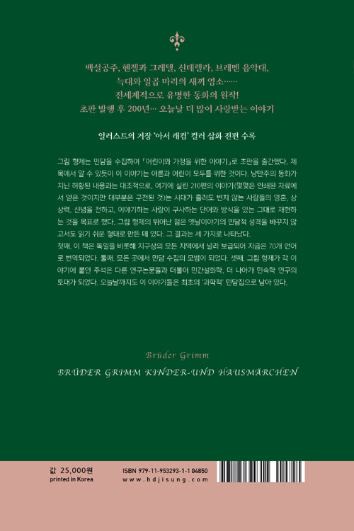 그림 형제는 유럽 지역에 전해 내려오던 이야기들 속에서 인간적인 심성의 기원이 무엇인지를 밝히고자 노력했고, 이들의 노력으로 이 이야기들은 시간이 지날수록 더 많은 사람들에게 사랑받고 있다. 이 책에 담긴 총 210편의 원작(Original)을 통해 인간 본성의 여러 가지 모습과 함께 색다른 재미를 느낄 수 있다.