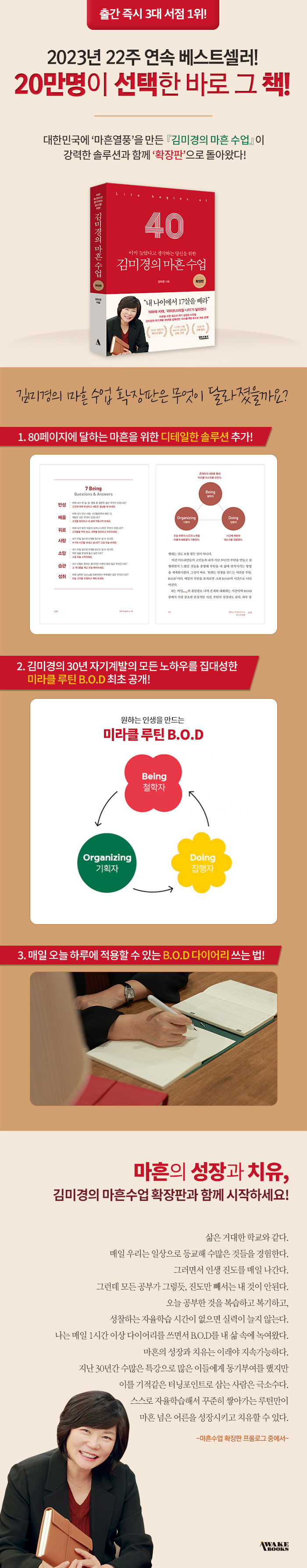 매일 반복되는 루틴으로 꾸준히 쌓아올려야만 지속가능하다. B.O.D는 Being(존재), Organizing(기획), Doing(집행)을 합한 말로 김미경의 30년 자기계발 노하우를 집대성한 자기성장과 치유 방법론이다. 이번 확장판에서는 ‘미라클 루틴 B.O.D’를 최초 공개하고 B.O.D에 대한 각각의 설명과 다이어리 쓰는 법까지 추가된 70페이지에 자세히 설명했다. ≪김미경의 마흔수업 확장판≫은 국내 최초로 마흔에 대한 재정의부터 마인드셋, 그리고 스스로 실행할 수 있는 방법론까지 총정리한 마흔을 위한 지침서이다.