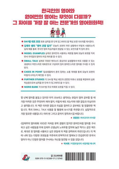 대한민국 영어 학습자가 직면하는 주요 문제들을 해결하기 위한 실질적인 해결책을 제시하며, 저자 자신의 경험과 성공적인 영어 습득 사례를 바탕으로 영어 회화 실력 향상을 위해 중요한 요소들을 집중적으로 다루었다. 원어민이 입에 달고 사는 패턴과 표현을 최대한 농축함으로써 100일이라는 기간 동안 학습 효과를 극대화할 수 있도록 구성되어 있다.