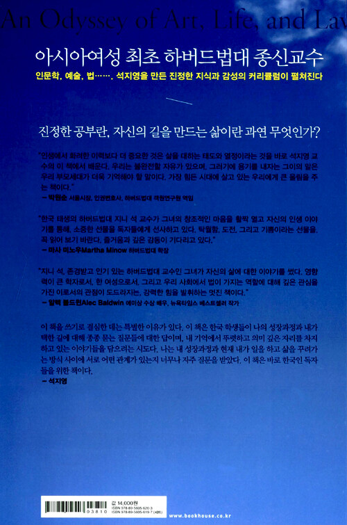 이 책은 석지영 교수가 한국 독자들을 위해 처음으로 쓴 에세이다. 인문학, 예술, 법……. 석지영을 만든 지식과 교양의 커리큘럼이 펼쳐진다. 오늘날 그녀의 바탕이 된 인문학 기본기와 자기단련의 과정이 생생히 그려진다. 진정한 공부란 무엇인가, 자신의 길을 만들어가는 삶이란 과연 무엇인가 되묻는 책이다.