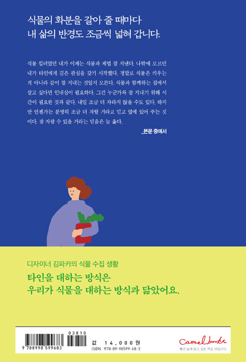 식물이 말을 할 줄 안다면 대체 뭐라고 할까. 물을 달라, 햇빛이 필요하다, 핸드폰 그만 보고 일찍 좀 자라, 패스트푸드는 삼가라, 울지 마라 등 다양하겠지만 그중 나에게 건네는 첫마디는 단연코 “쓸데없이 집착하지 말고 너만의 리듬대로 살아라.”일 것 같다. 공간 디자이너에서 ‘잼프로젝트’라는 브랜드를 만들어 운영하는 디자이너로, 식물 킬러에서 식물 동반자로 살고 있는 일러스트레이터 김파카가 글과 그림을 엮어 첫 식물 에세이를 내놓았다.