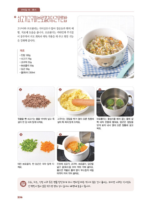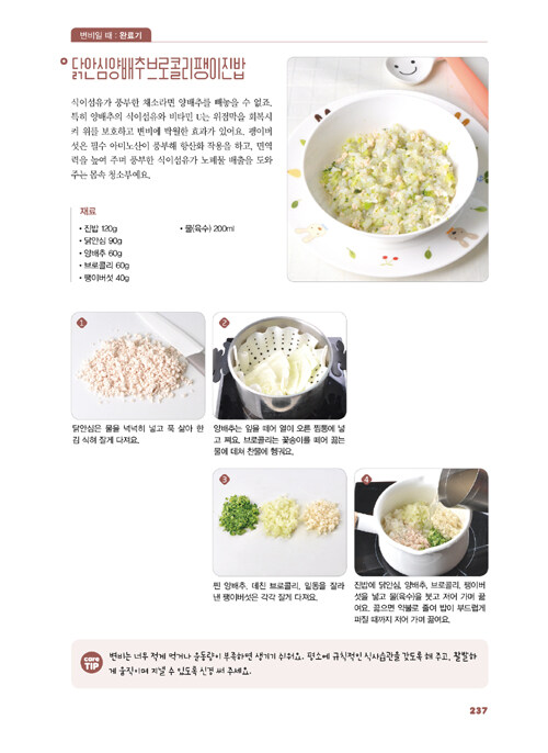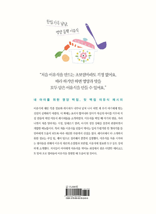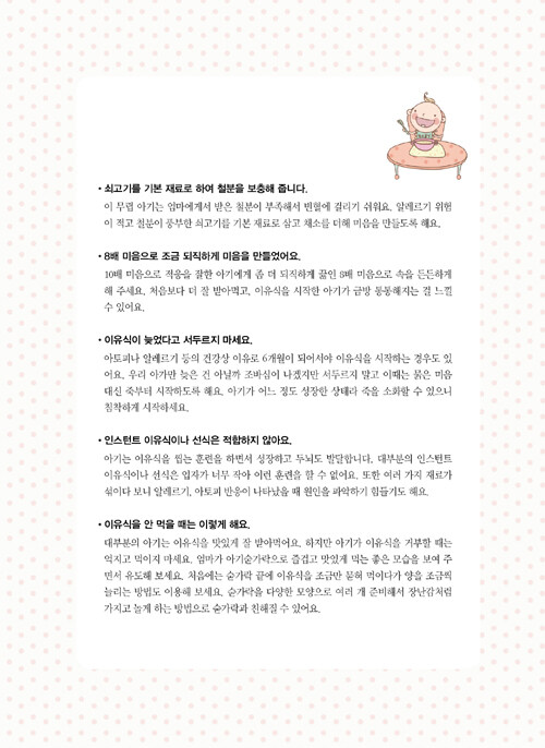 이유식에 대해 막연한 두려움을 가지고 있는 엄마들을 위해 이유식을 시작하는 시기, 이유식을 먹이는 시간과 방법, 이유식 재료의 손질법과 보관법, 이유식에 필요한 도구 등 이유식의 기본에 대해서도 상세하게 설명하였다. 또한 아기 이유식에는 절대 간을 하지 말아야 한다든지, 아기가 자라서 올바른 식탁예절을 갖출 수 있도록 이유식을 먹일 때부터 좋은 습관을 들이는 방법 등을 알려 준다.
