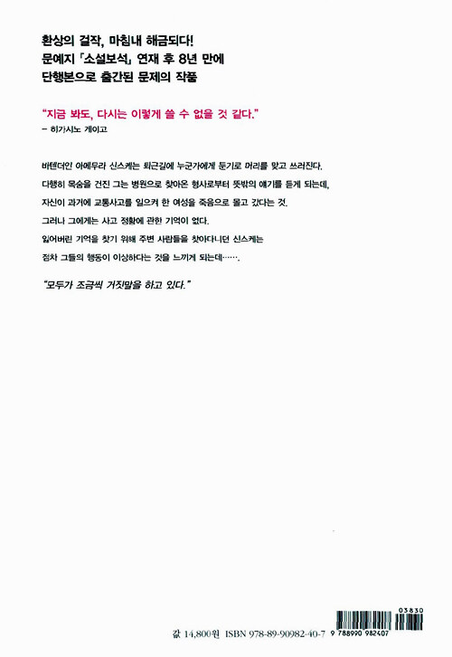 <용의자 X의 헌신>, <백야행>의 작가 히가시노 게이고의 미스터리 호러 소설. 문예지 「소설보석」에 1998년 2월부터 1999년 1월까지 연재되었던 장편소설로, 연재 후 8년이라는 긴 시간이 지난 후에야 해금되어 단행본으로 세상의 빛을 보게 된 작품이다. 히가시노 게이고는 이 작품에 대해 “다시는 이렇게 쓸 수 없을 것 같다”고 말한 바 있다.