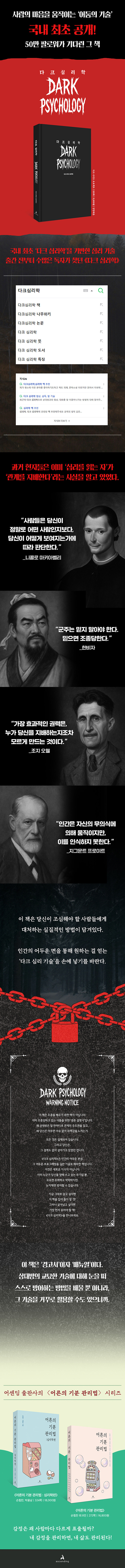 국내 최초 다크 심리학을 기반한 심리 기술을 담아낸 《다크 심리학》은 인간의 본성, 그 ‘어두운 프로그래밍’을 실전 기술로 해부한 책이다. 이 책에 담긴 ‘다크 심리 기술’은 우리가 실생활에서 타인을 설득(조종)하고, 갈등을 해결(조작)할 수 있는 탁월한 방법들을 정리한 것이다. 이를 통해 누구나 다양한 관계에서 만연한 심리적 조작에서 벗어날 수 있으며, 반대로 나에게 유리하게 이끄는 기술을 배울 수 있다.