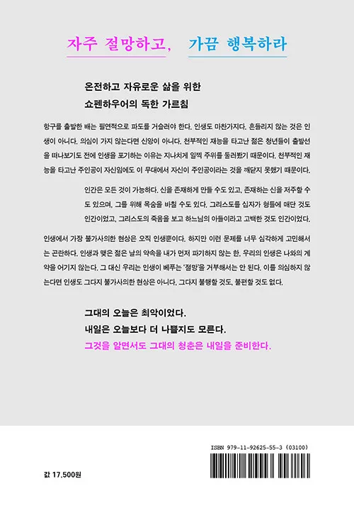 쇼펜하우어는 니체의 철학, 헤세와 카프카의 문학, 프로이트와 융의 심리학에 지대한 영향을 끼친, 19세기 서양 철학계의 상징적인 인물이다. 그는 “인생은 의미가 없다. 그러므로 태어나지 않는 것이 최선이고, 태어났다면 최대한 빨리 죽는 것이 차선이다.”라고 말해 흔히 염세주의자로 알려졌지만, 그 어떤 철학자, 작가보다 치열하게 살았다.