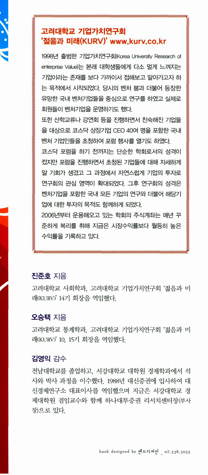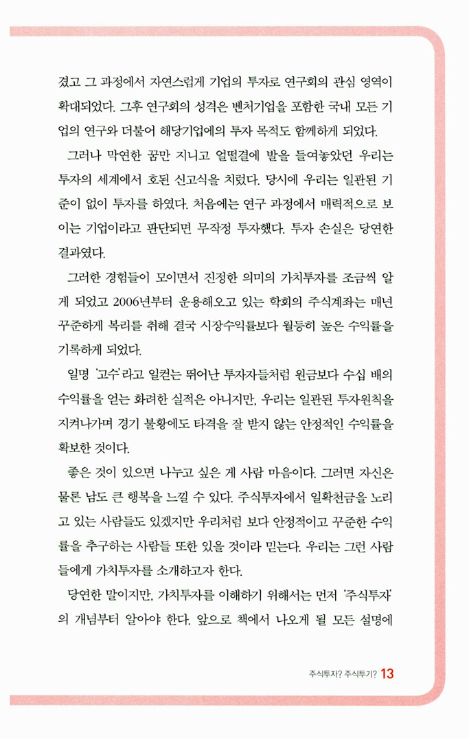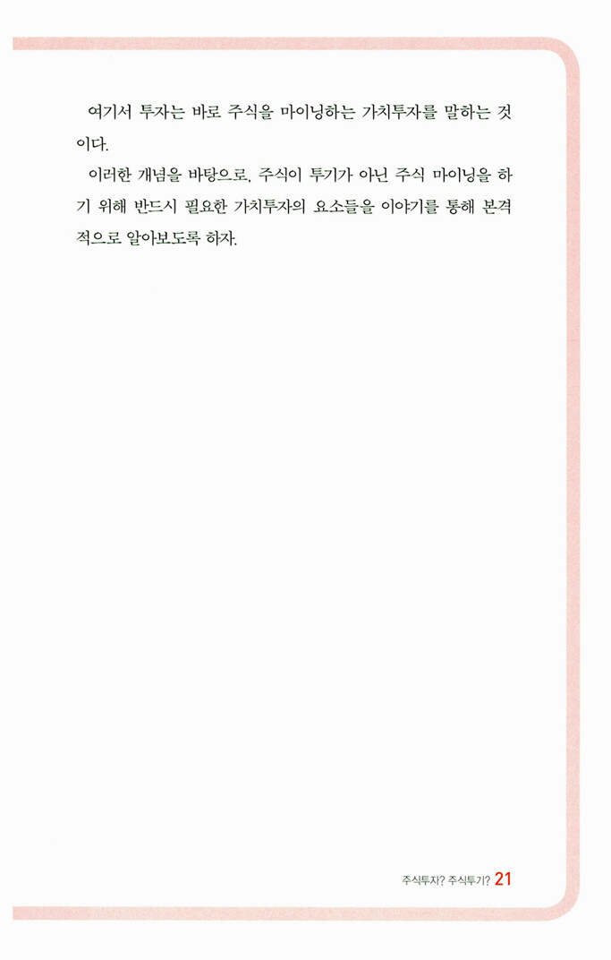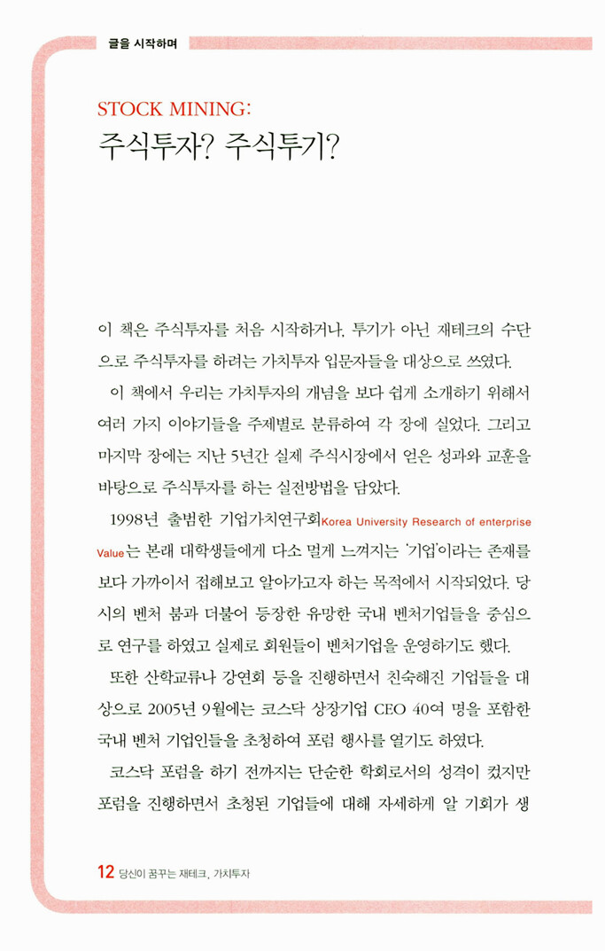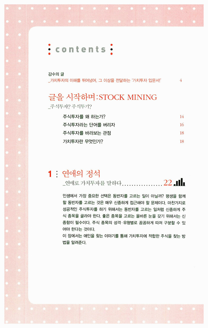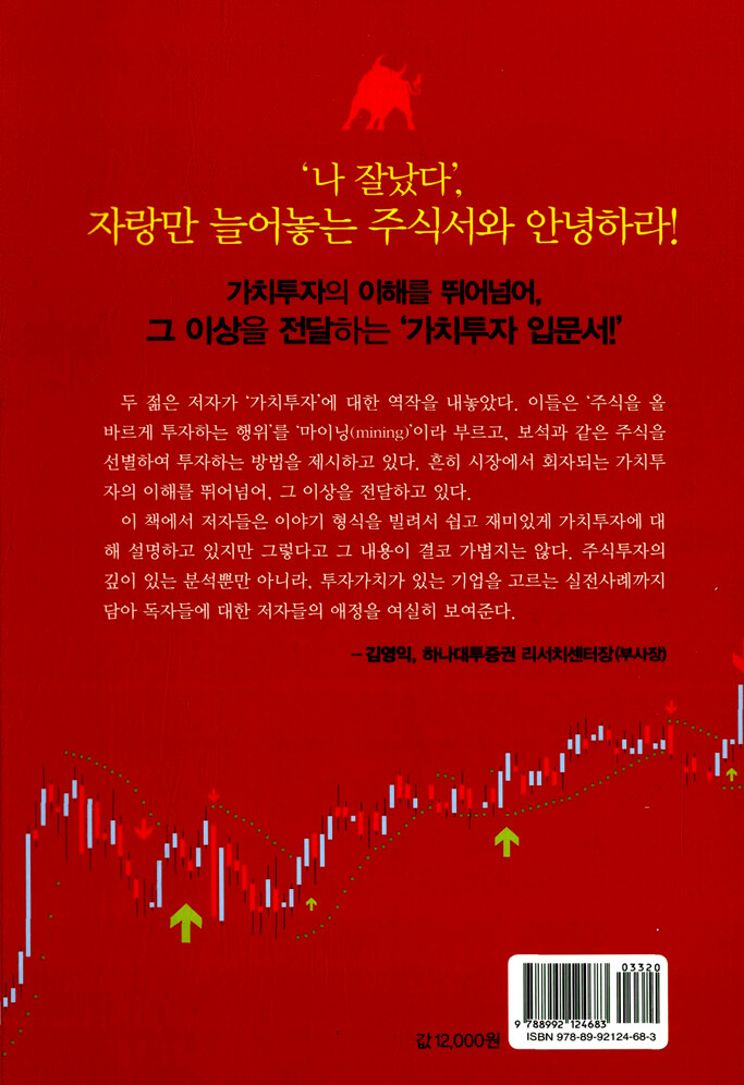 ‘주식을 올바르게 투자하는 행위’를 ‘마이닝(mining)’이라 부르고, 보석과 같은 주식을 선별하여 투자하는 방법을 제시하였다. 저자들은 이야기 형식을 빌려서 쉽고 재미있게 가치투자에 대해 설명하고, 주식투자의 깊이 있는 분석뿐만 아니라, 투자가치가 있는 기업을 고르는 실전사례까지 담아 독자들에 대한 저자들의 애정을 여실히 보여준다.