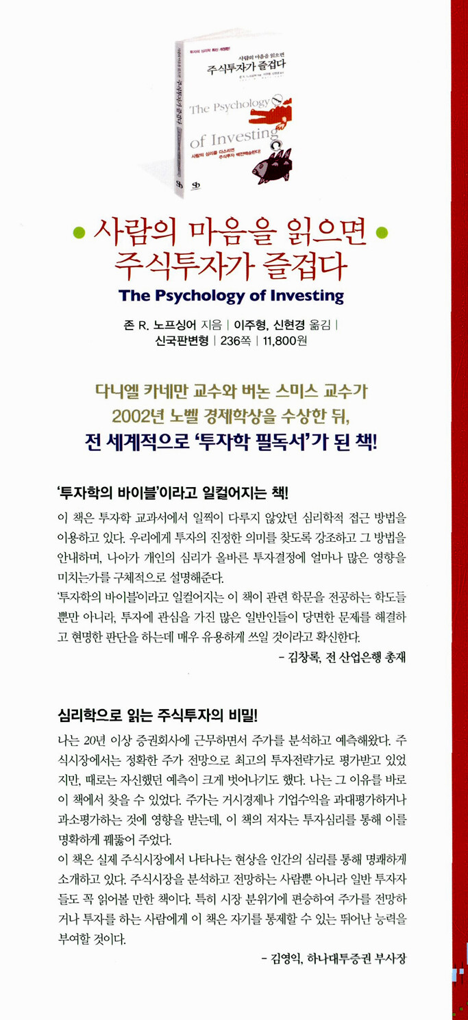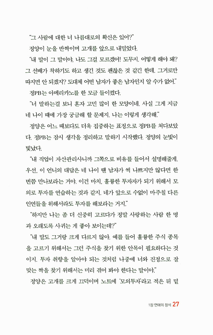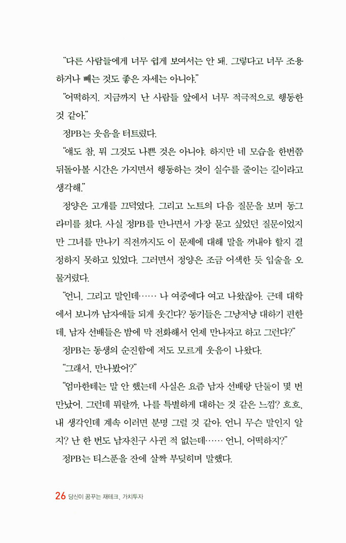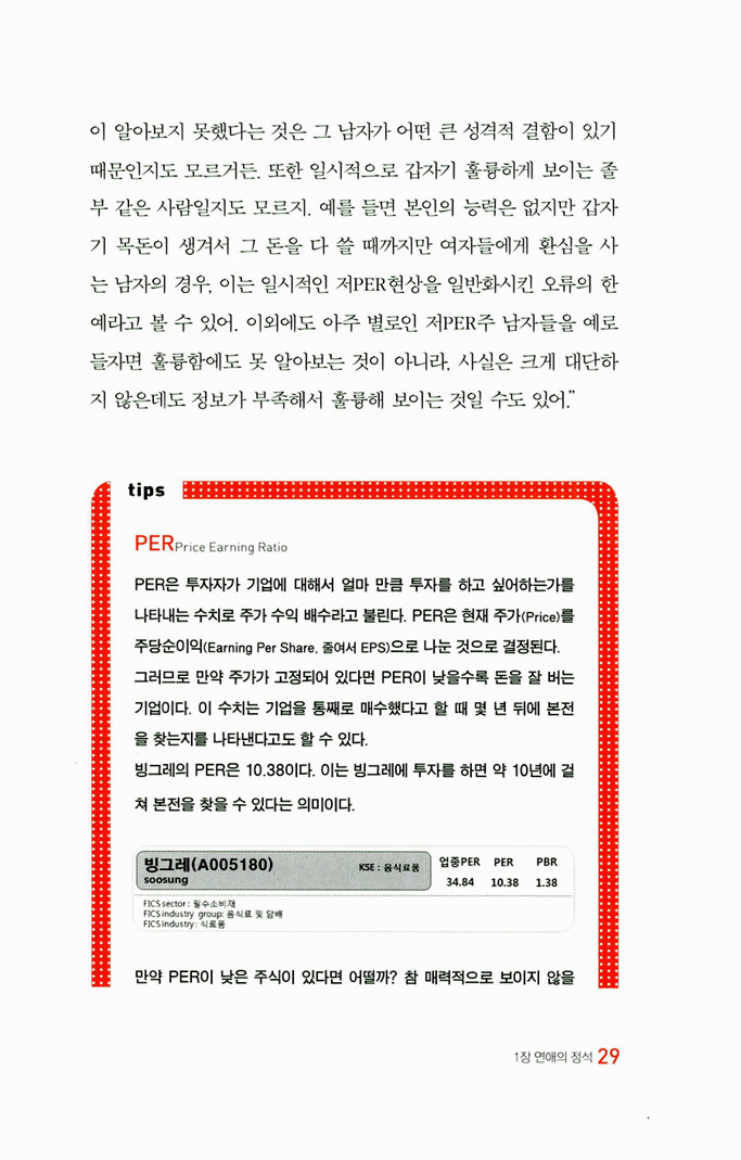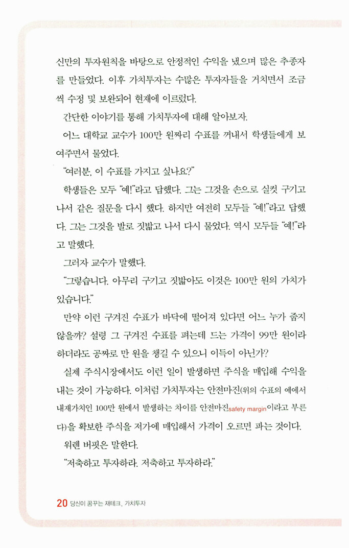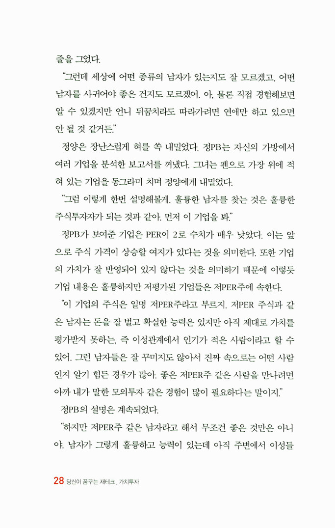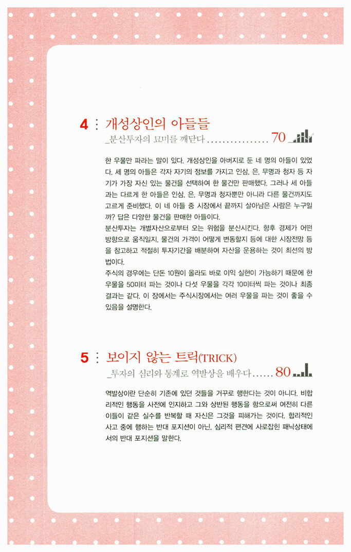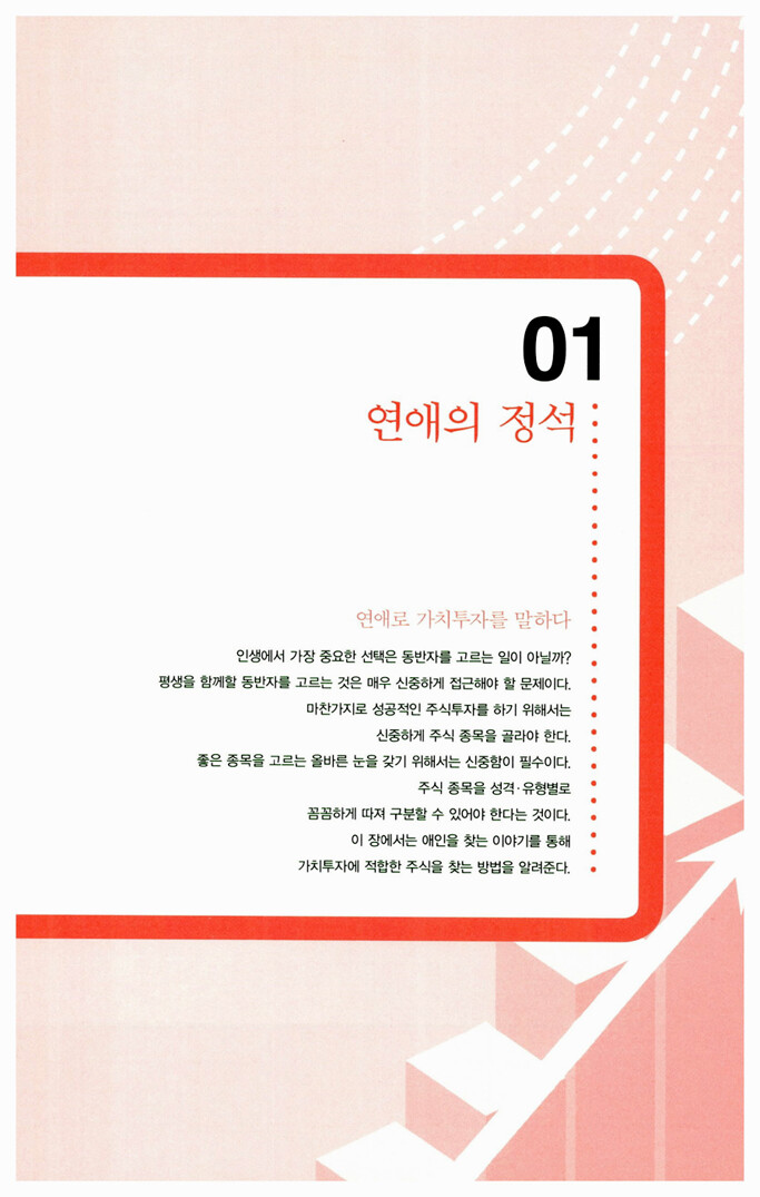 세상에는 여러 사람이 있듯이, 주식에도 성장기대주, 경기방어주, 우량주 등 여러 종목들이 있다. 이렇듯 좋은 동반자를 고르는 것처럼 좋은 종목을 고르기 위해서는 신중함이 필수이다. 개미와 진딧물, 하늘소와 베짱이 이야기를 통해 재테크에서 가장 필요한 투자금을 만드는 비법과 복리에 대해 소개한다. 또한, 향후 경제가 어떤 방향으로 움직일지, 물건의 가격이 어떻게 변동할지 등에 대한 시장전망 등을 참고하고 적절히 투자기간을 배분하여 자산을 운용하는 방법을 설명한다.