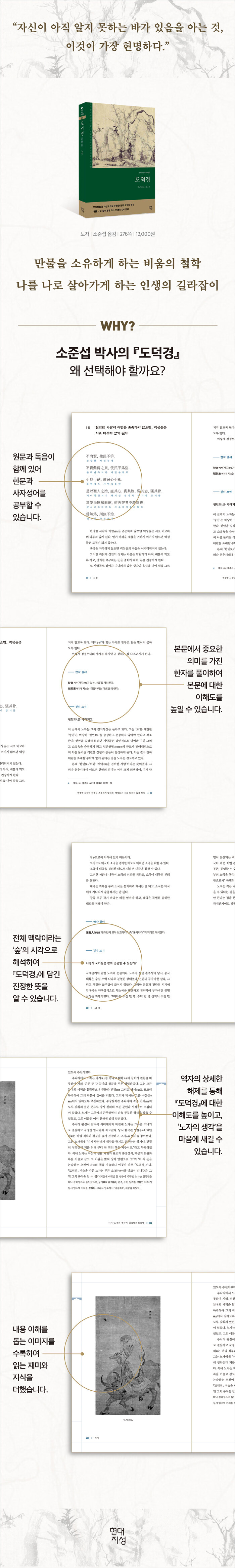 무위無爲와 자연自然을 주창한 동양 철학의 정수. 『도덕경』은 『주역』 그리고 『논어』와 함께 중국을 비롯한 동아시아의 사상 및 철학 체계에 가장 심대한 영향을 끼친 책 중 한 권이다. 도가의 시조인 노자의 어록으로 알려진 『도덕경』은 비교적 짧은 5,000여 자의 글로 구성되어 있지만 그 안에는 정치, 철학, 병법, 과학, 그리고 양생지도養生之道에 대한 논술까지 포함되어 있어 예로부터 수많은 지식인들의 애독서이자 영감의 원천이 되어 왔다.