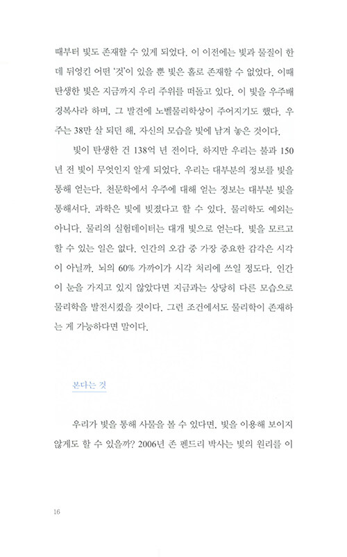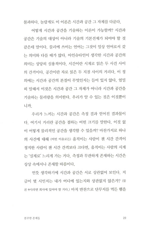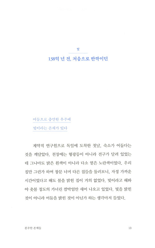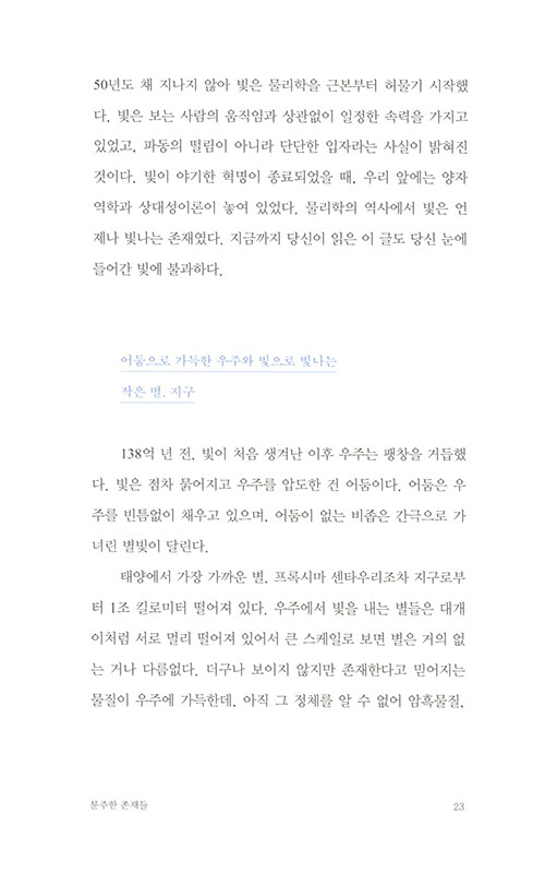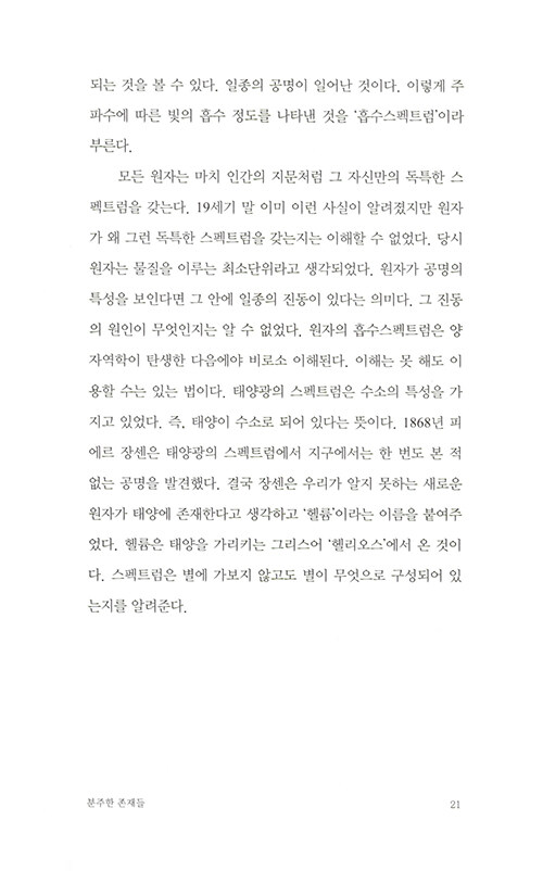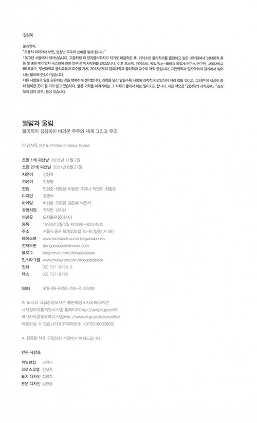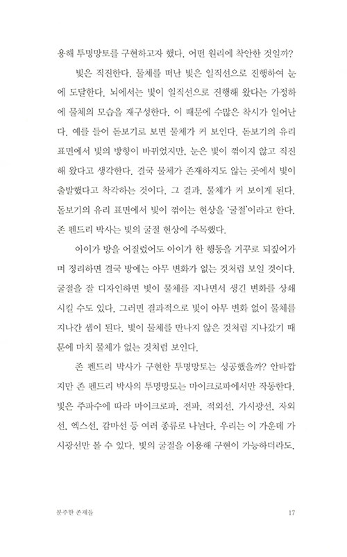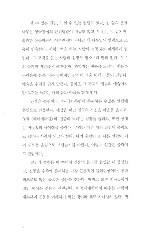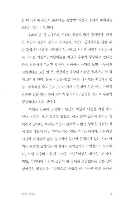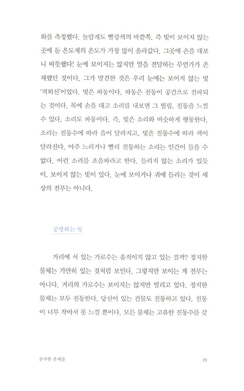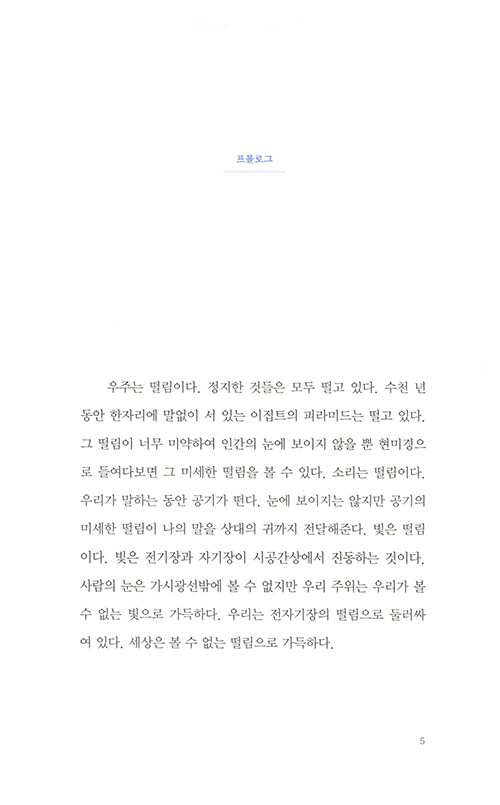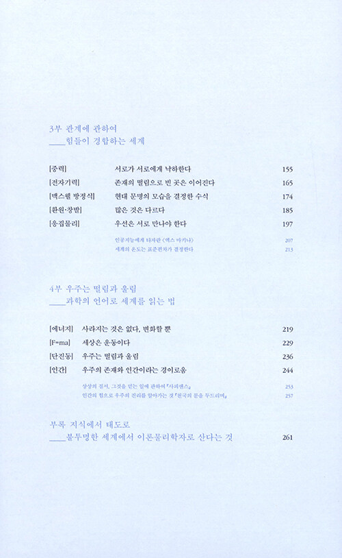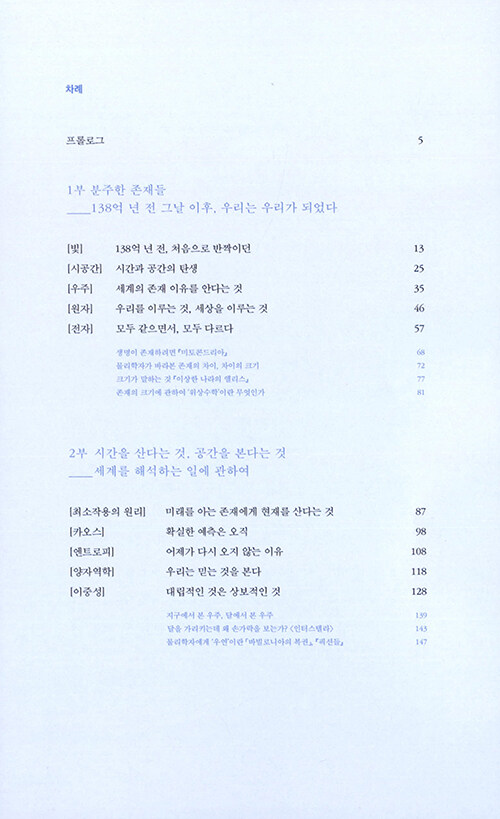 물리학자가 원자로 이루어진 세계를 보는 방식은 마치 동양철학의 경구를 읽는 듯 하다. 나의 존재를 이루는 것들은 어디에서 시작되었는지, 죽음을 어떻게 성찰할 수 있을지, 타자와 나의 차이는 무엇인지… 엄밀한 과학의 정답을 제시하는 대신 물리학자만이 안내할 수 있는 새로운 시선을 제시해준다.