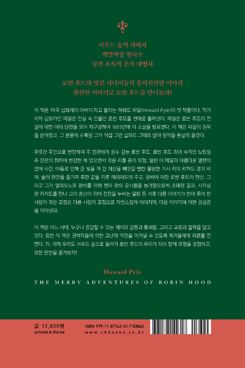 사람들은 ‘로빈 후드’하면 ‘명사수 중의 명사수!’ 아마도 활을 쏘아 과녁에 박힌 화살을 정확히 반으로 쪼개는 장면을 가장 먼저 연상할 것이다. 아니면 셔우드 숲을 근거지로 삼고 신출귀몰, 악한 귀족들을 약탈하고 혼내주며, 가난한 사람들을 돕는 링컨 초록색 옷을 입은 의적을 떠올릴 수도 있다. 사람들이 로빈 후드를 어떤 식으로 떠올리든 그에 대해 단편적으로 기억할 것이다. 이 책은 우리에게 로빈 후드에 대한 완전한 이야기를 전한다.