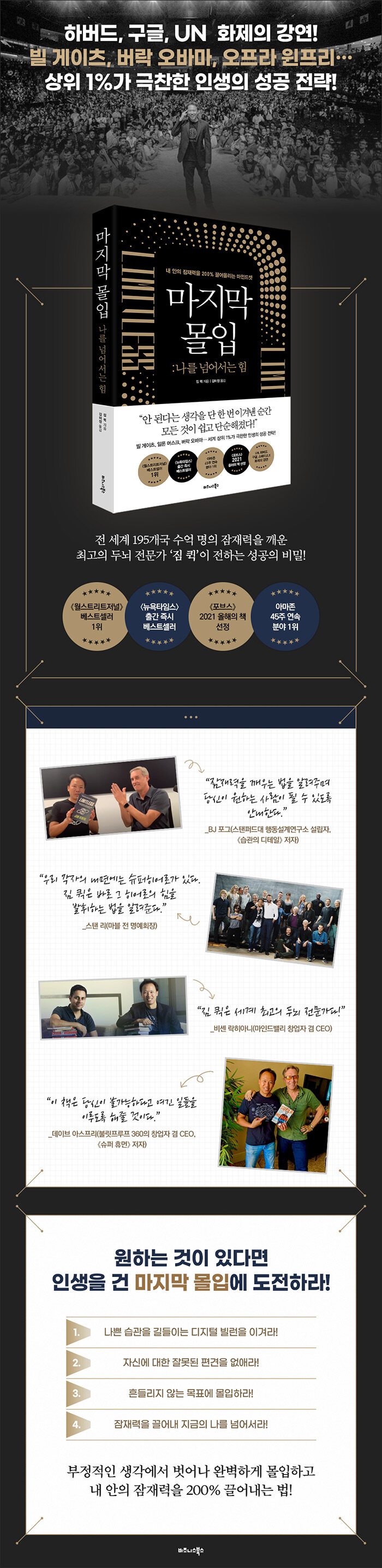 짐 퀵은 나이, 배경, 교육, IQ에 상관없이 인간이라면 누구라도 뇌, 추진력, 기억력, 집중력, 습관의 한계를 넘을 수 있다고 주장한다. 이를 실현하기 위해 마인드셋, 동기부여, 방법 이 세 가지 영역을 아우르는 성공 전략을 직접 밝혀냈다. 특히 잠재력을 최대치로 끌어올릴 수 있는 짐 퀵만의 집중, 학습, 기억력, 속독, 사고 전략은 전 세계 195개국의 수억 명이 열광한 매우 효과적이고 널리 검증된 방법들로 그 핵심이 《마지막 몰입: 나를 넘어서는 힘》에 아낌없이 담겨 있다.