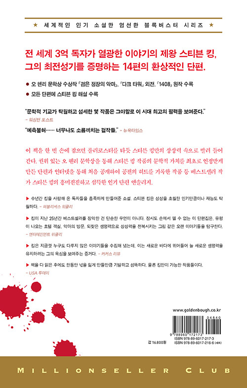 밀리언셀러 클럽 100권 돌파 기념작으로 출간된 공포 소설의 거장 스티븐 킹의 단편집. 오 헨리 문학상 수상작 ‘검은 정장의 악마’를 포함한 14편의 단편이 수록되어 있다. 스티븐 킹의 대표작인 <다크 타워> 시리즈의 외전, 영화 [1408]의 원작, E-Book으로 첫선을 보여 화제가 된 ‘총알차 타기’ 등이 실려 있다.