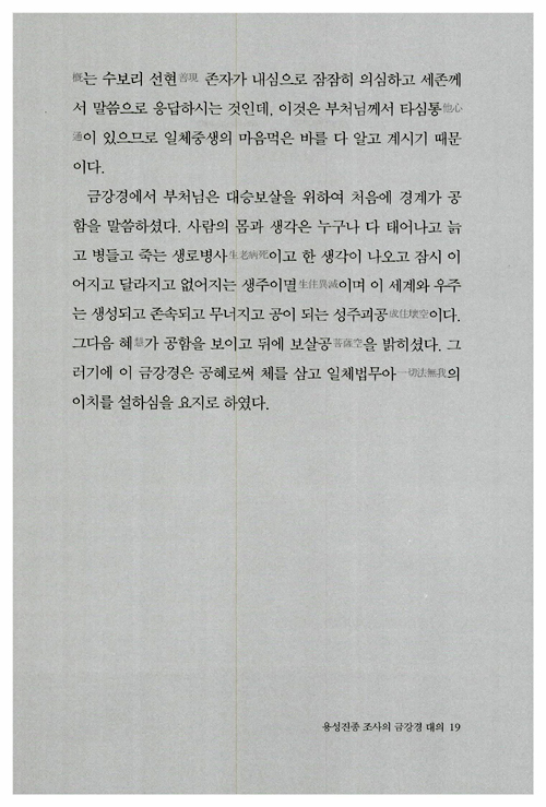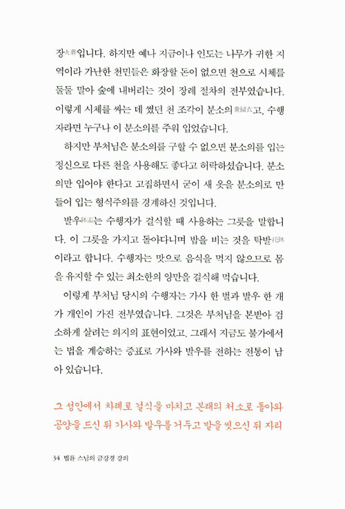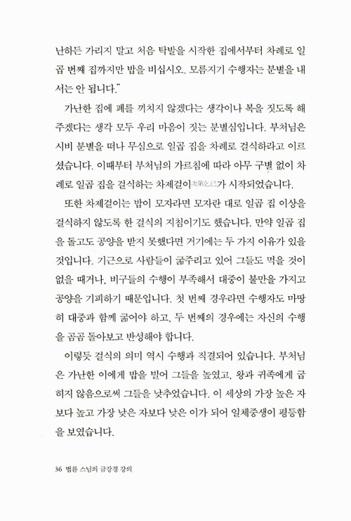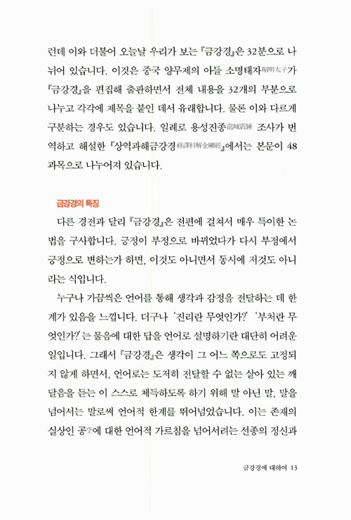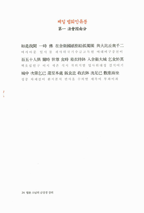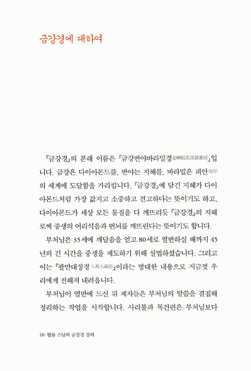 <금강경 강의>는 법륜스님이 금강경에 대해 여러 차례 법문한 것을 모으고 다듬어 새롭게 엮었다. 깊은 고뇌의 대중들과 나눈 문답, 스님이 수행생활을 하며 겪었던 일화 등 지금 내 삶과 밀착된 풍부한 예화를 통해 지금 살아 숨 쉬는 경전이 되게 한다. 스스로 인생의 주인이 되고자 하는 이들이라면 이 책의 마지막 장을 덮는 순간 새롭게 변해있는 자신을 발견할 수 있을 것이다.