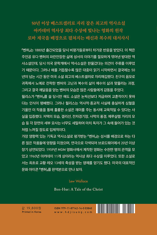 50년 이상 베스트셀러로 자리 잡은 최고의 역사소설, 『벤허』의 완역본. 월리스가 『벤허』를 쓸 당시만 해도 소설은 논픽션보다 저급하며 교훈적이지 못하다는 인식이 팽배했다. 그러나 월리스는 역사적.종교적 사실에 충실하게 심혈을 기울인 이 작품을 통해 훌륭한 소설은 재미를 주는 동시에 교육적일 수 있다는 사실을 입증했다.