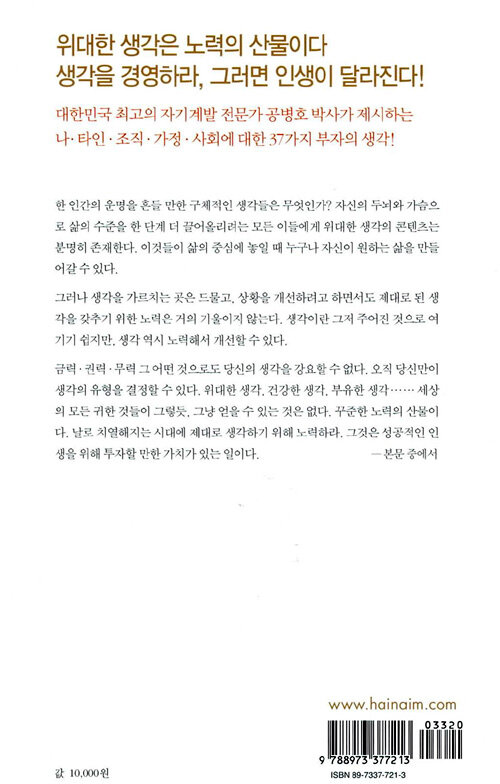 저자의 치열한 삶을 통해, 그리고 다양한 현장에서 직접 만나거나 문헌을 통해 알게 된 성공한 이들의 사례에서 그는 그들의 인생에 중요한 추동력이 되었던 일정한 생각의 콘텐츠를 추출해 내고, 어떠한 외부 조건도 아닌 그러한 생각들이야말로 그들의 성공을 결정짓는 핵심 요인이었음을 설명한다. 도대체 구체적으로 어떤 내용의 생각들을 해야 스스로 원하는 삶을 살아갈 수 있는 것인가?