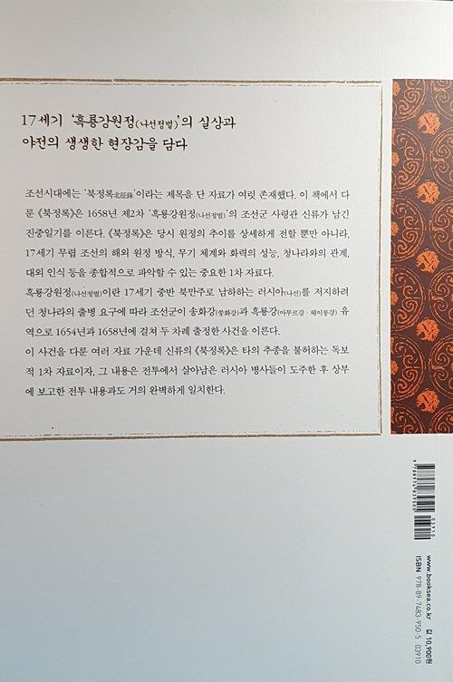 오래된 책방 22권. 조선시대에는 ‘북정록’이라는 제목을 단 자료가 여럿 존재했다. 이 책에서 다룬 <북정록>은 1658년 제2차 ‘흑룡강원정(나선정벌)’의 조선군 사령관 신류가 남긴 진중일기를 이른다. <북정록>은 당시 원정의 추이를 상세하게 전할 뿐만 아니라, 17세기 무렵 조선의 해외 원정 방식, 무기 체계와 화력의 성능, 청나라와의 관계, 대외 인식 등을 종합적으로 파악할 수 있는 중요한 1차 자료다.
