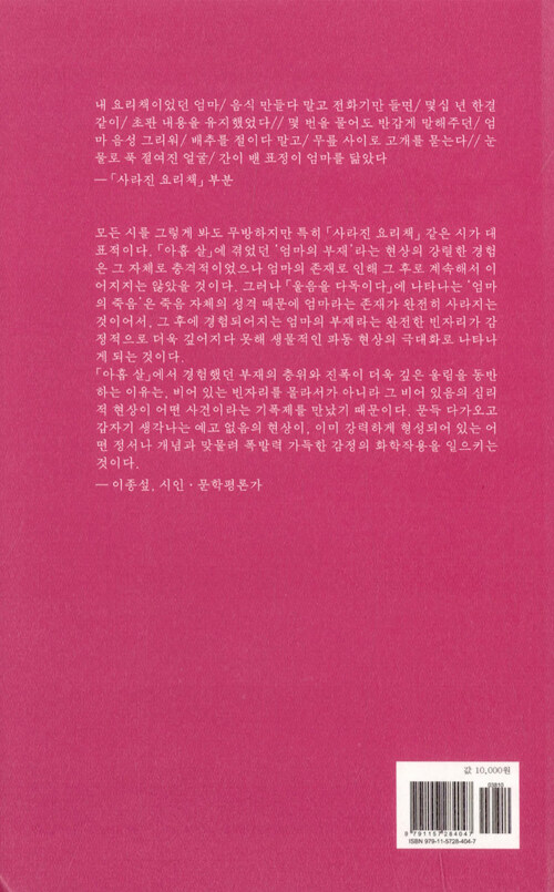 신수옥 시인의 첫 번째 시집. 엄마의 부재, 또는 엄마의 죽음이라는 심리적 충격의 변주이며, 그 그리움이 서정시의 진수로 울려퍼지고 있다고 할 수가 있다. 그리움은 사랑이 되고, 이 사랑은 부재의 층위와 그 울림을 통해 더욱더 ‘비어있음의 파동과 완성’을 보여준다.
