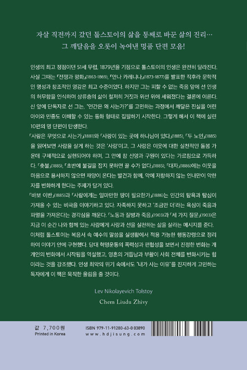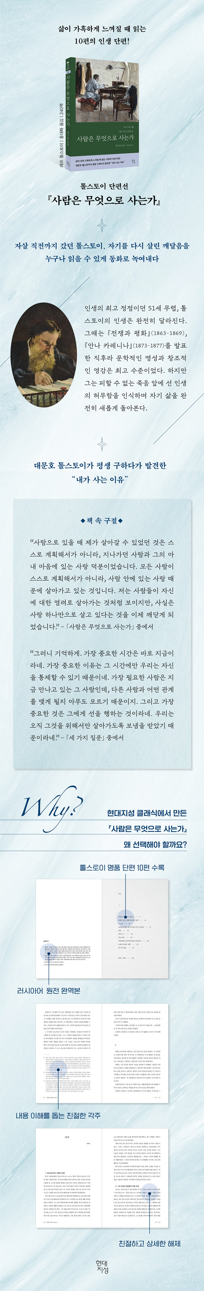 위대한 소설가로 세계적인 명성을 누렸던 시절에도 채울 수 없었던 톨스토이의 마음을 만족하게 한 것은 무엇이었을까? 그 깨달음으로 살아갈 이유를 찾은 후 작품의 색깔까지 완전히 바꾸어 집필한 10편의 명 단편이 현대지성 클래식 제34권, 『사람은 무엇으로 사는가』로 독자들과 만난다.