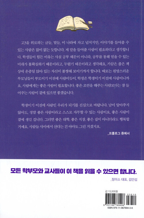 이 책의 저자는 고등학생이다. 독서실의 삼파장 형광등 아래에서 완성된 그의 공부와 사색과 일상에 대한 기록들이 책에 담겨 있다. ‘위스콘신 주립대 교육학과 진학 예정자’라거나 ‘EBS 장학퀴즈 왕중왕전 출전자’, ‘카카오브런치 공모전 최초 고등학생 대상 수상자’라는 그의 이력보다도, 교육학을 계속 공부해 대한민국의 교육을 조금 더 바람직하게 바꾸어 가는 사람 중 한 명이 되고 싶다는 그의 다짐이 책에 가치를 더한다.