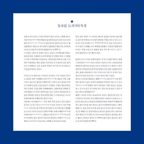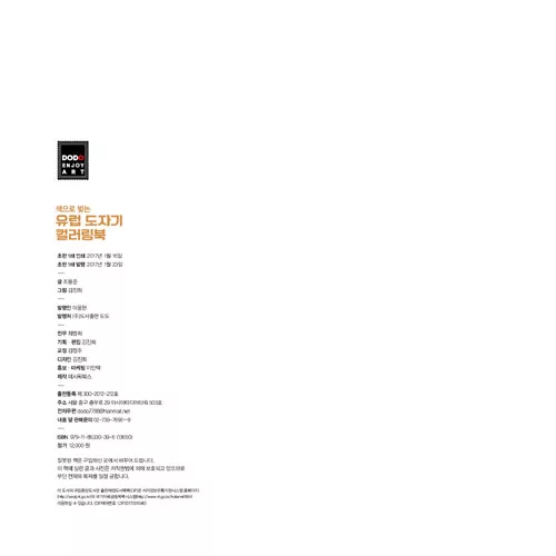 유럽 도자기 여행’ 시리즈를 탐독한 이들에게 색다른 즐거움을 전하는 컬러링북이다. 또한 전작을 읽어보지 않은 사람에게는 유럽 도자기에 대한 관심에 불씨를 지피는 안내서가 될 수도 있다. 책 속에는 ‘유럽 도자기 여행’ 시리즈 세 권에서 가려 뽑은 약 80점에 달하는 아름다운 도자기 도안이 담겨 있으며, 실제 사진과 더불어 각 도자기의 이력과 특징이 함축적으로 소개되어 있다.