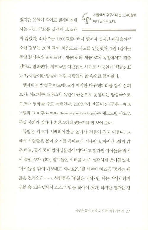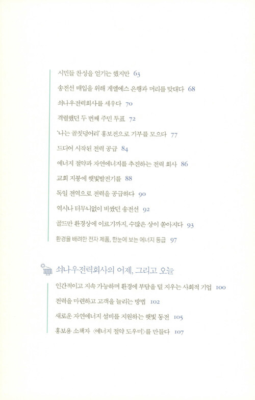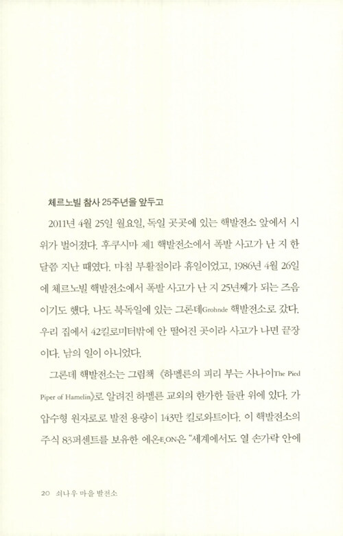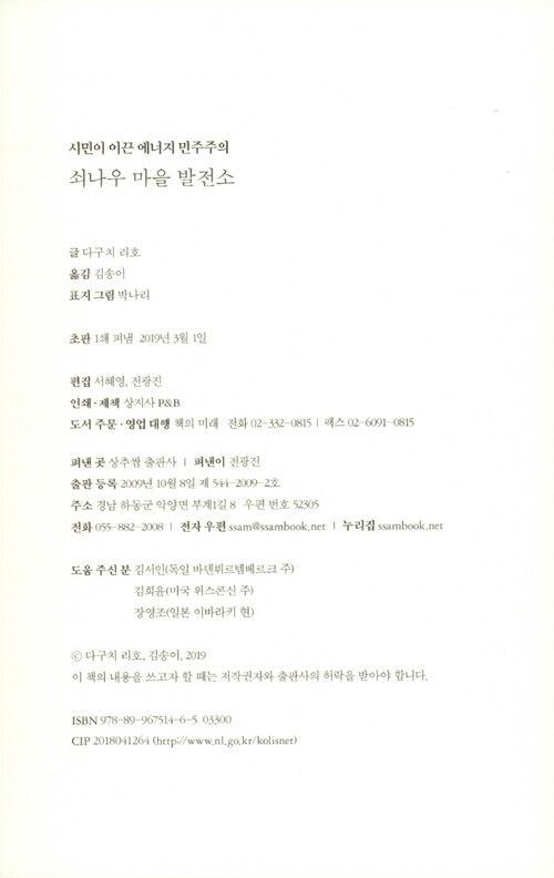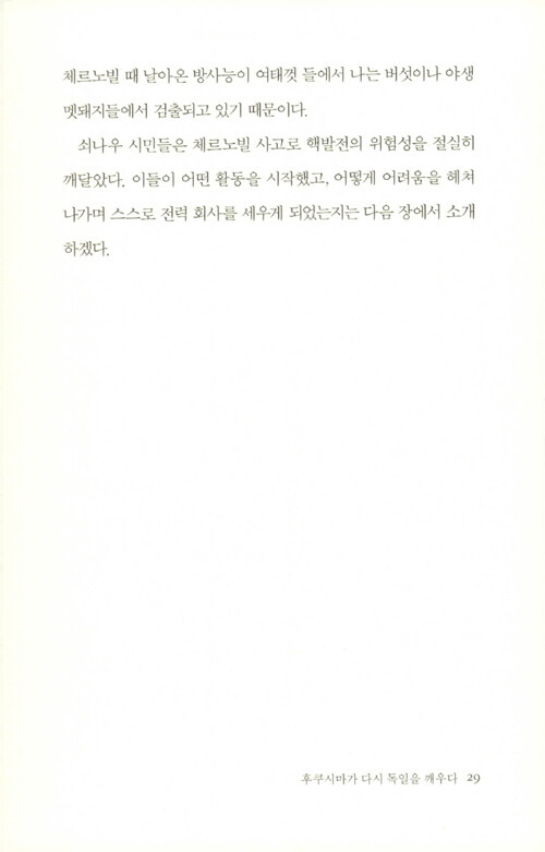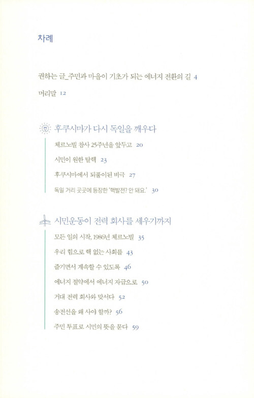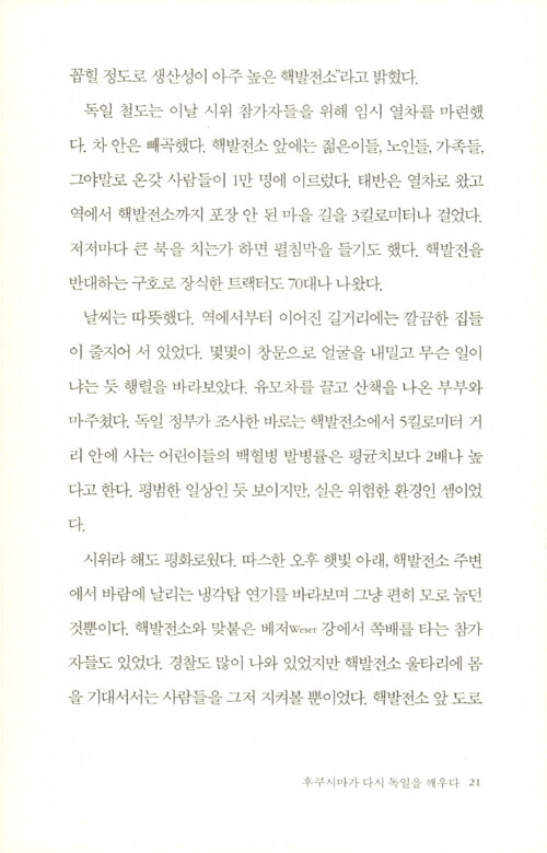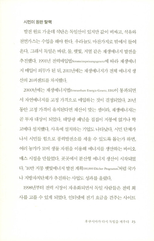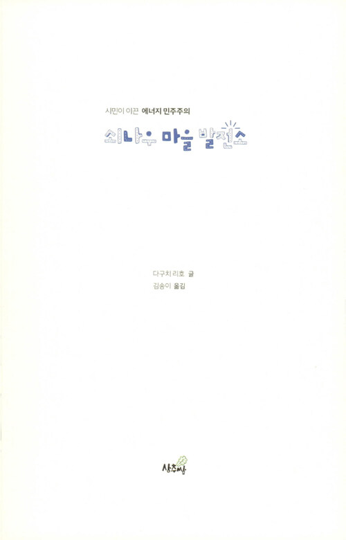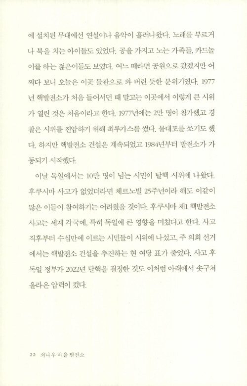 ‘다른 길’은 결코 쉽지 않았다. 쇠나우의 시민들은 모든 것을 걸고, 자신이 할 수 있는 모든 것을 다해 비로소 그 길을 열었다. 《쇠나우 마을 발전소》는 그 여정을 찬찬히 좇는다. 3·11 참사를 겪은 고국에 건네기 위해 쇠나우의 모험담을 차분히 듣고 정리한, 재독 언론인 다구치 리호 씨의 시선은 절실하고 깊다.