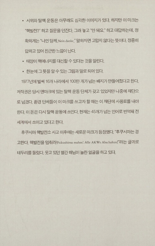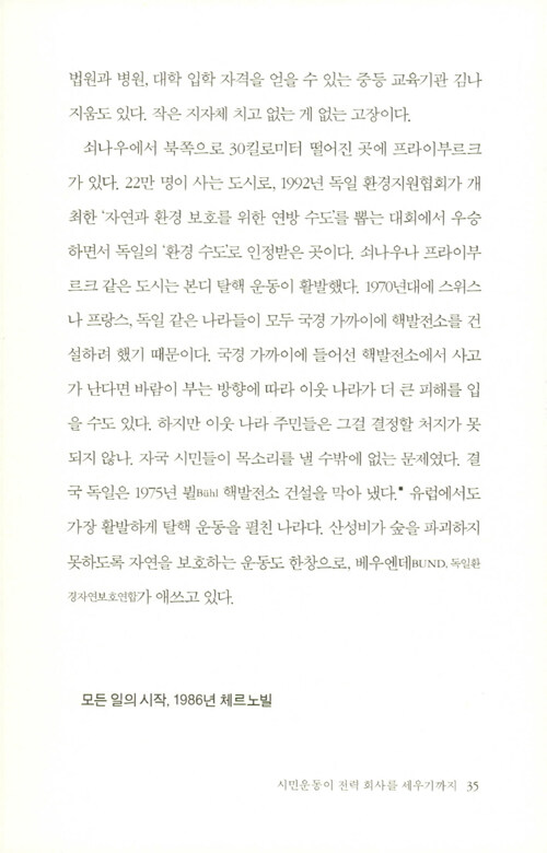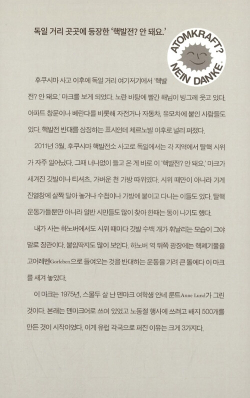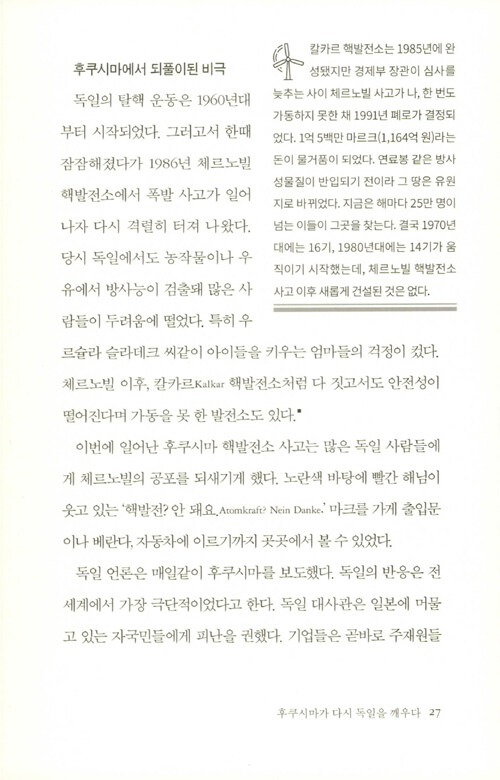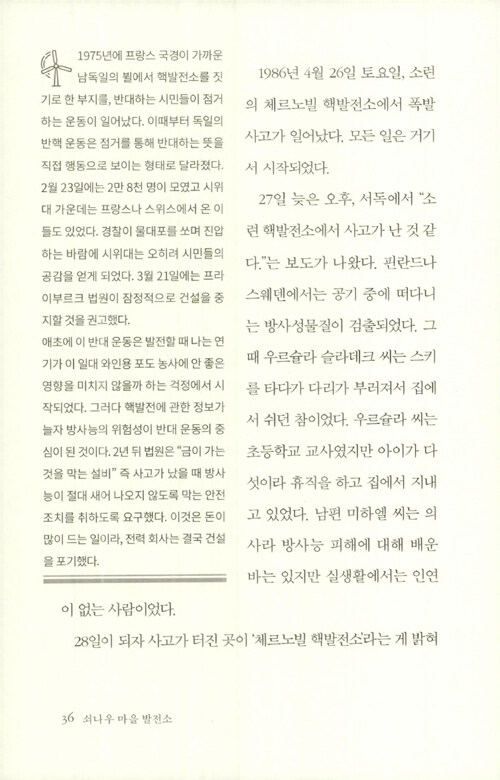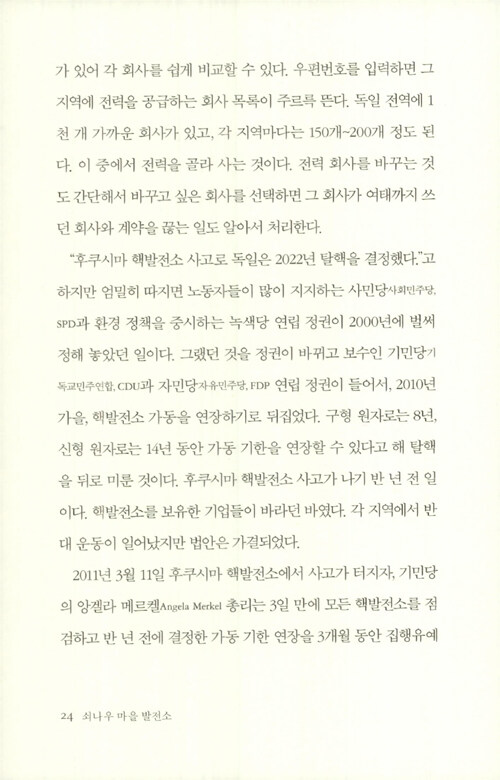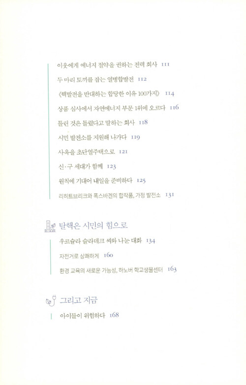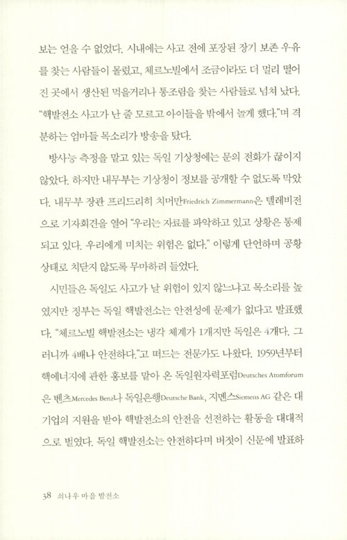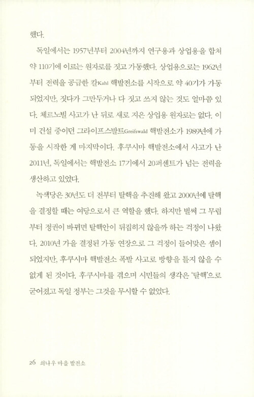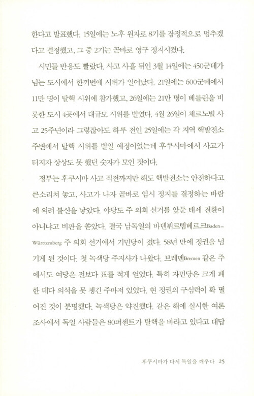‘다른 길’은 결코 쉽지 않았다. 쇠나우의 시민들은 모든 것을 걸고, 자신이 할 수 있는 모든 것을 다해 비로소 그 길을 열었다. 《쇠나우 마을 발전소》는 그 여정을 찬찬히 좇는다. 3·11 참사를 겪은 고국에 건네기 위해 쇠나우의 모험담을 차분히 듣고 정리한, 재독 언론인 다구치 리호 씨의 시선은 절실하고 깊다.