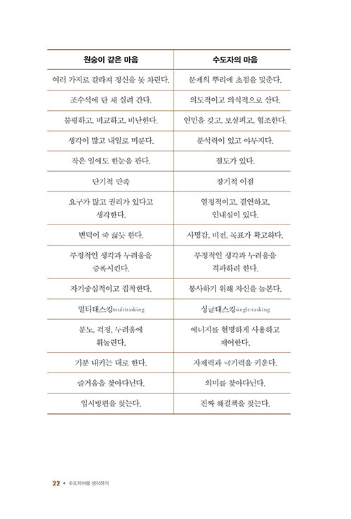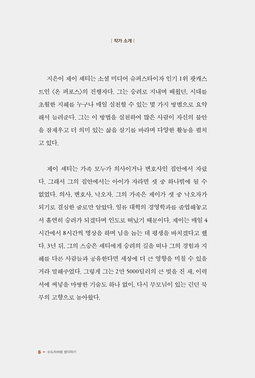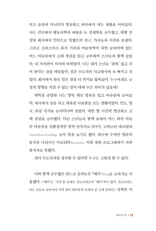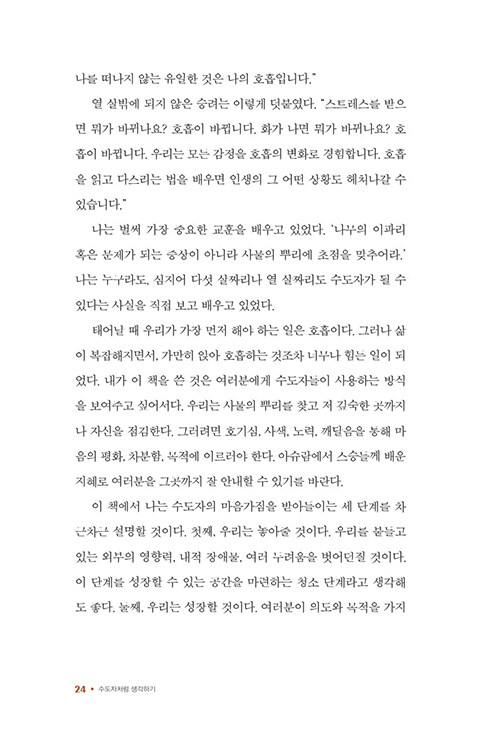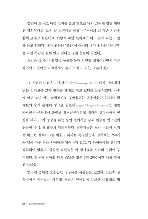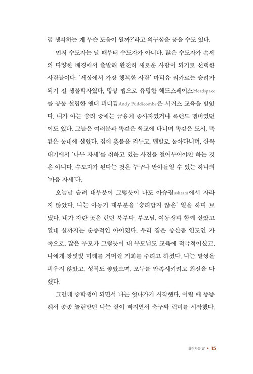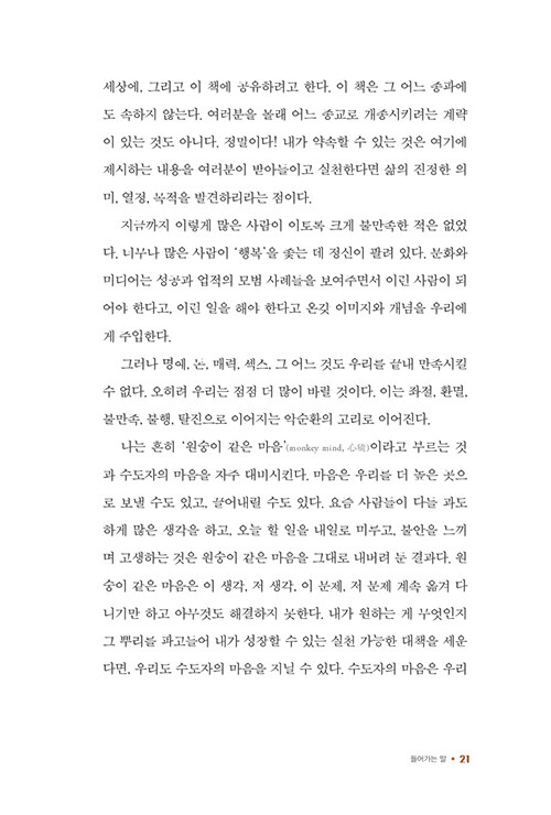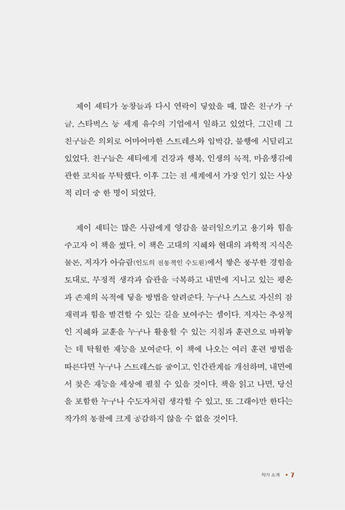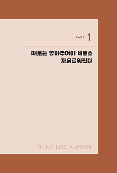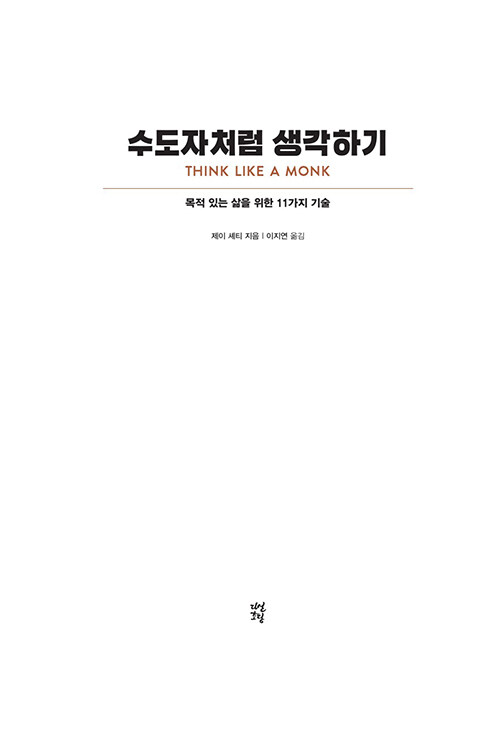 전직 승려이자 동기부여 철학자, 전 세계인의 마음챙김 코치인 저자는 행복을 좇지 않으면서도 평화롭고 의미 있는 삶을 영위할 수 있도록 ‘수도자처럼 생각하기’를 권한다. 저자가 말하는 수도자의 사고법은 수천 년 전 발생하여 오늘날에도 유의미한 가치를 지닌, 시대를 초월한 고전의 지혜를 비롯해, 저자 자신이 일상에서 직접 적용하고 있는 고대의 여러 가르침을 바탕으로 고안한 실천적 삶의 양식이다. 저자는 실제 인도에서 승려로 지내며 수도자의 삶에서 배운 영원한 지혜를 매일 수행할 수 있는 실용적인 방법으로 다듬고, ‘놓아주고, 성장하고, 나누는’ 세 단계를 안내한다.