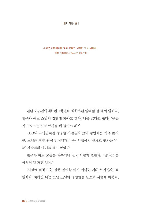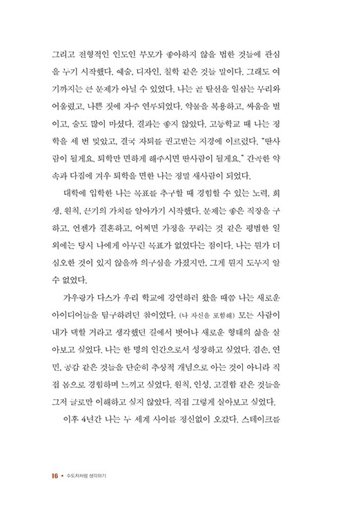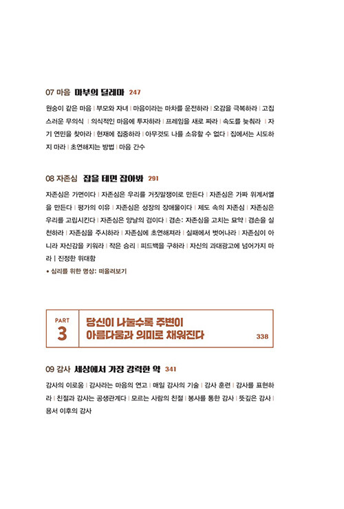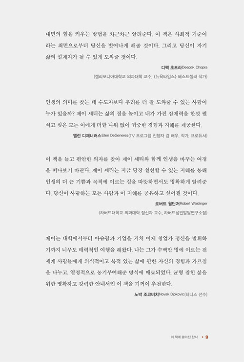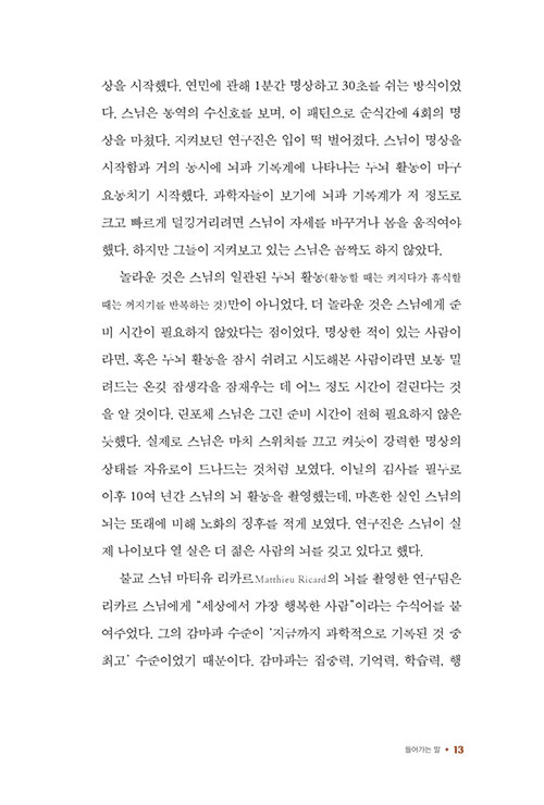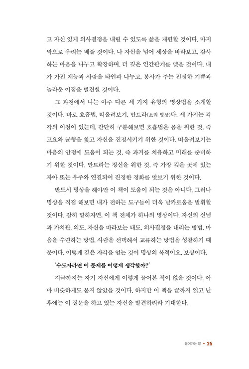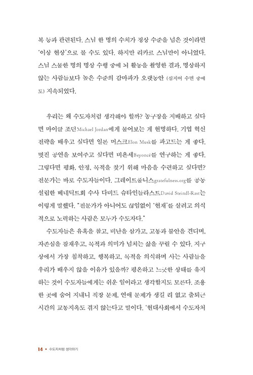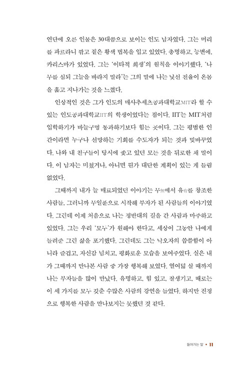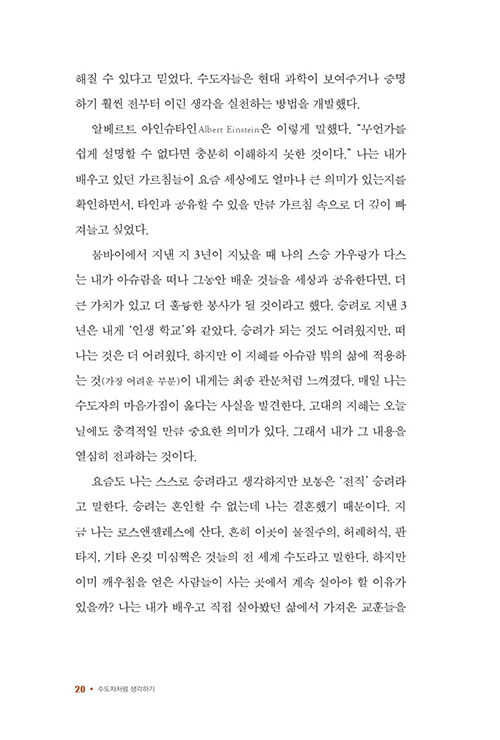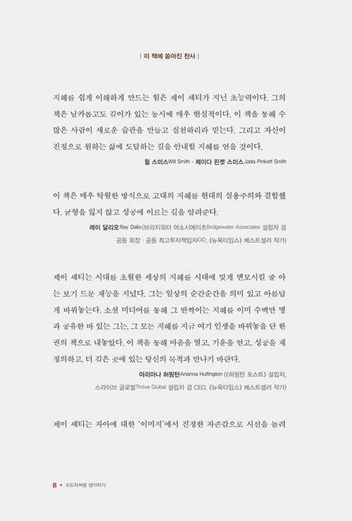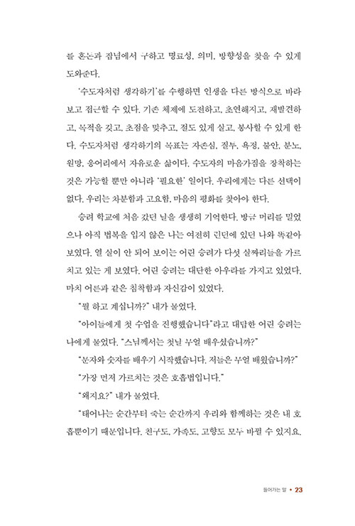 전직 승려이자 동기부여 철학자, 전 세계인의 마음챙김 코치인 저자는 행복을 좇지 않으면서도 평화롭고 의미 있는 삶을 영위할 수 있도록 ‘수도자처럼 생각하기’를 권한다. 저자가 말하는 수도자의 사고법은 수천 년 전 발생하여 오늘날에도 유의미한 가치를 지닌, 시대를 초월한 고전의 지혜를 비롯해, 저자 자신이 일상에서 직접 적용하고 있는 고대의 여러 가르침을 바탕으로 고안한 실천적 삶의 양식이다. 저자는 실제 인도에서 승려로 지내며 수도자의 삶에서 배운 영원한 지혜를 매일 수행할 수 있는 실용적인 방법으로 다듬고, ‘놓아주고, 성장하고, 나누는’ 세 단계를 안내한다.