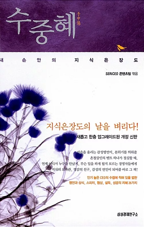 곁에 두고 그때그때 살짝 꺼내 활용할 수 있는 필살기 《내 손안의 지식은장도, 수중혜手中慧》의 개정 신판. 경영자가 알아야 할 최신 트렌드와 상식, 사람들의 마음을 움직이는 명언과 감성멘트, 직원들과 공감대를 형성하는 데 필요한 유머와 문화 이슈, 와인과 건강 지식 등이 담겨 있다. 이번 개정 신판은 기존의 내용을 보강하여 재구성하는 한편, 다양한 분야에서 배우는 경영과 성공의 지혜, 스피치와 설득, 협상의 기술 등 새로이 10여 편을 추가하여 더욱 충실해진 모습을 보여준다.