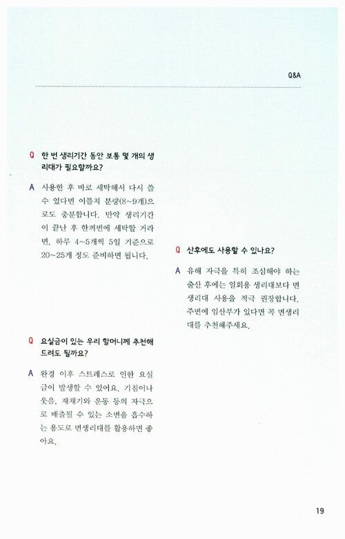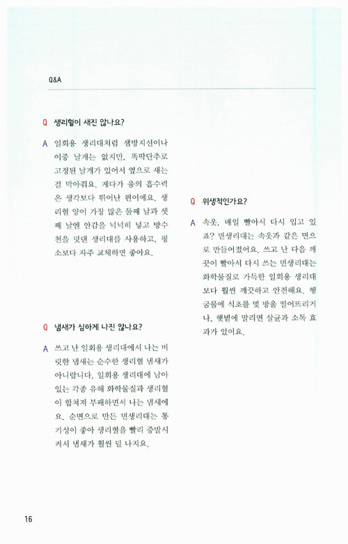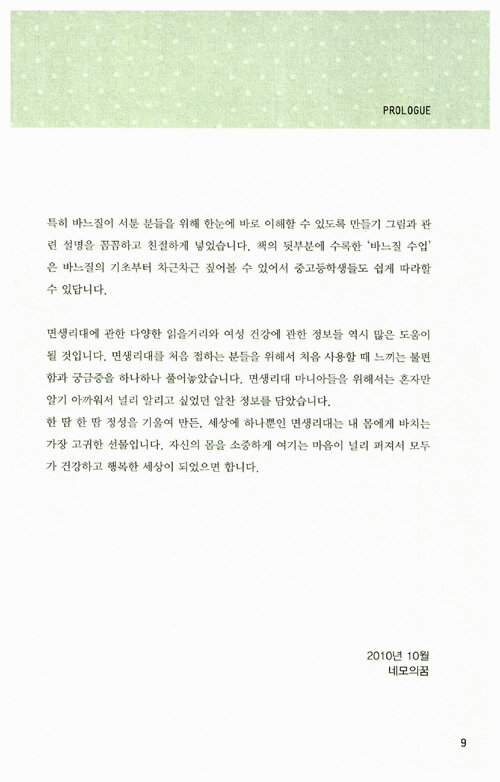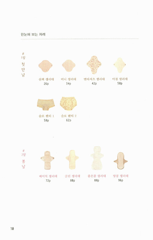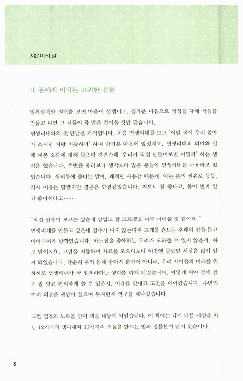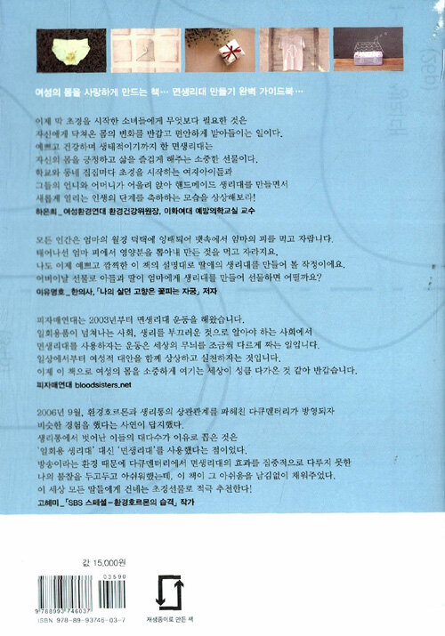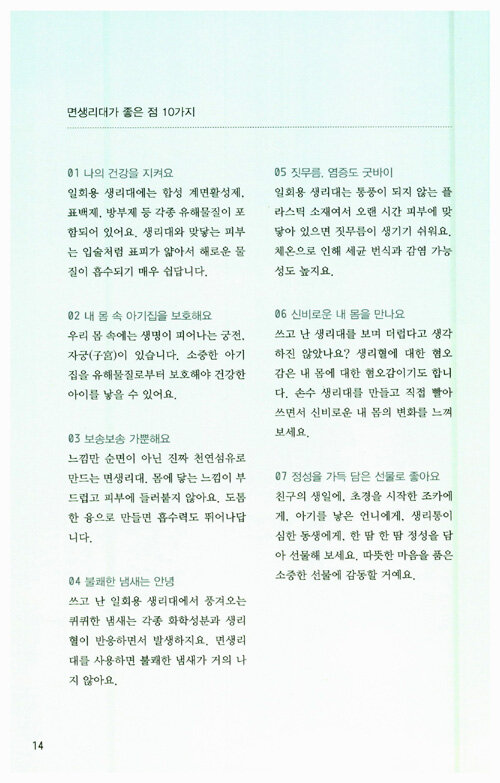 대안생활문화 캠페인을 펼쳐 온 ‘여성환경연대’와 친환경 소재를 활용한 바느질 공방 ‘네모의꿈’이 함께 만든 면생리대 DIY 안내서이다. ‘산책 생리대’, ‘아침 생리대’, ‘좋은꿈 생리대’ 등 핸드메이드 생리대 12가지와 에코백, 파우치 등 관련 소품 10가지를 만드는 방법을 소개하며, 면생리대를 처음 만나는 독자를 위한 Q&A 등 상세한 사용 안내가 수록되어 있다.