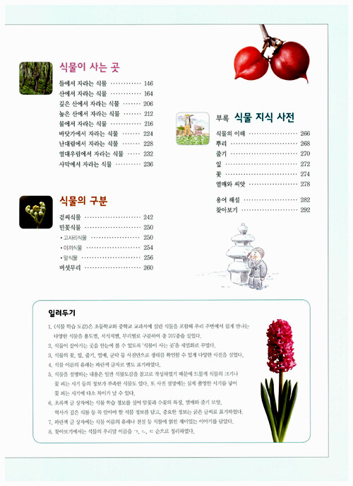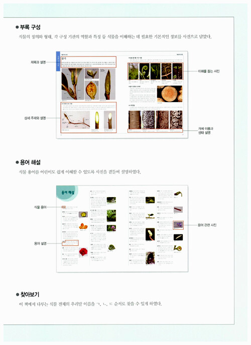 암꽃과 수꽃의 특징, 비슷한 식물 구분하기 등 꼭 알아야 할 식물 정보는 ‘초록색 글 상자’에, 이름의 유래나 전설 등 식물에 관한 재미있는 이야기는 ‘파란색 글 상자’에 팁으로 수록해 책 속에서 생생한 식물 강의가 펼쳐진다. 식물은 어떤 생물인지, 풀과 나무의 구분, 뿌리.줄기.잎.꽃.열매.씨앗 등 각 기관의 특징까지 식물에 대한 전반적인 정보를 알려 주는 ‘식물 지식 사전’을 부록에 담았다.