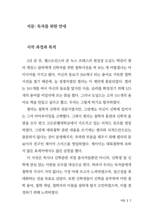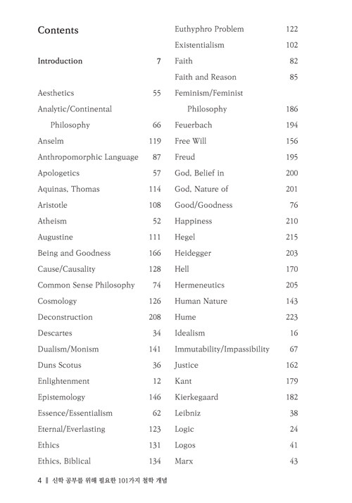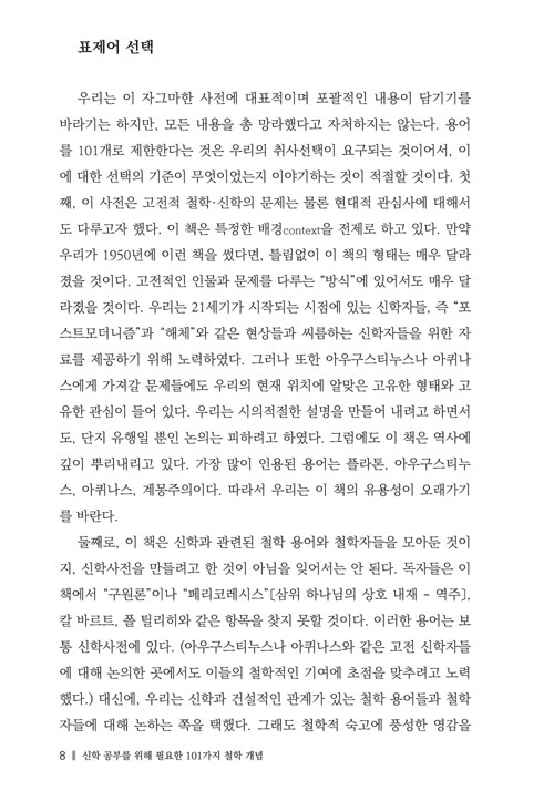 두 명의 철학자와 한 명의 신학자가 쓴 <101가지 철학 개념>은 철학의 핵심 용어에 쉽게 접근하도록 도와주며, 철학 용어들이 신학에서 어떻게 이해되고 사용되었는지를 알려줄 것이다. 이 책의 각 표제어를 보면, 고전 철학 및 현대 철학에서 이 개념이 무엇을 의미했는지에 대해 먼저 논의한다. 그 다음 그러한 철학적 이해가 기독교 신학의 역사에서 어떤 의미가 있었는지, 그리고 특히 오늘날에 어떤 의미가 있는지에 대해 이야기한다.