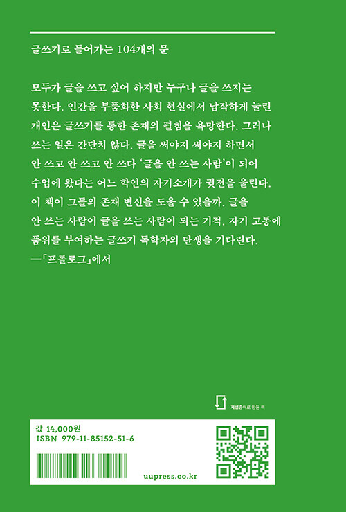 글 쓰는 사람 은유의 ‘쓰기’ 아포리즘에 대한 문장들. 소소한 일상에서 의미를 발굴하는 안목과 낮고 작은 사람들과 공감하는 능력으로 자기만의 글쓰기를 선보인 저자가 니체, 조지 오웰부터 신영복, 김훈까지 쓰기에 관한 문장을 간추려 뽑아 안 쓰는 사람이 쓰는 사람이 되도록 이끄는 마중물 같은 글을 써냈다.