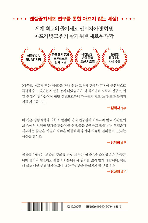 《아무도 아프지 않는 세상》은 엔젤줄기세포의 치료 원리와 체험 사례를 알기 쉽게 담고 있으며, 책은 노화와 질병이 필수가 아니라 선택사항이라는 메시지를 전달한다. 현재 바이오산업 분야에서 가장 영향력 있는 권위자가 120세 시대를 건강하게 장수하기 위한 새로운 과학을 소개한다.