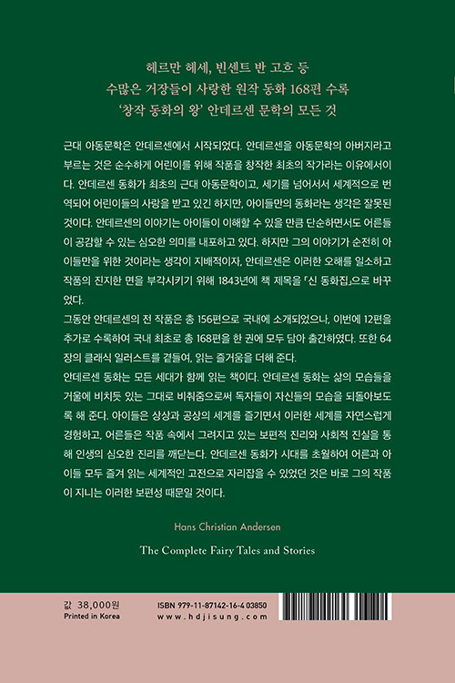 그동안 안데르센의 전 작품은 총 156편으로 국내에 소개되었으나, 이번에 현대지성에서 12편을 추가로 수록하여 국내 최초로 총 168편을 한 권에 모두 담아 출간하였다. 또한 64장의 클래식 일러스트를 곁들여, 읽는 즐거움을 더해 준다.