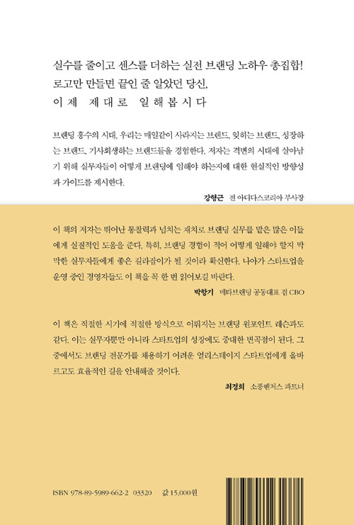 오늘날 브랜딩은 회사를 만들고 운영하는 데 있어 거의 필수적인 절차이자 과제다. 중요성이 커진 만큼 책, 강연, 팟캐스트 등 브랜딩 관련 콘텐츠들이 매일같이 쏟아지고 있다. 그런데 그 넘쳐나는 콘텐츠들을 실전에 써먹으려고 들여다보면 생각보다 추상적이고 막연해 난감한 경우가 많다. 대부분 이론이나 전략을 중점적으로 다루기 때문이다. 물론 이론을 익히고 전략을 터득하는 것 역시 아주 중요한 일이지만, 실무자들이 현장에서 맞닥뜨리는 브랜딩이 어떤 것인지 안다면 우리의 일이 훨씬 수월해질 것이다.