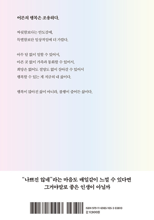 《어른의 행복은 조용하다》는 요란한 세상에서도 흔들리지 않고 내 삶을 살아가는 튼튼하고 단단한 태도를 담아냈다. 시끌벅적 기쁜 일을 찾아다니기보다도, 울 일이 없고 별다른 나쁜 일이 없는 하루를 만들어야 한다고 강조한다. 그랬을 때에야 비로소 진정한 행복이 우리 곁에 온다는 사실을 다시 한번 일깨워준다.