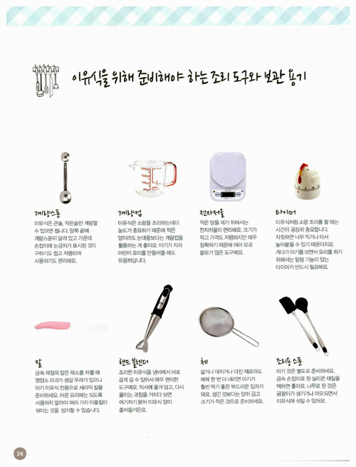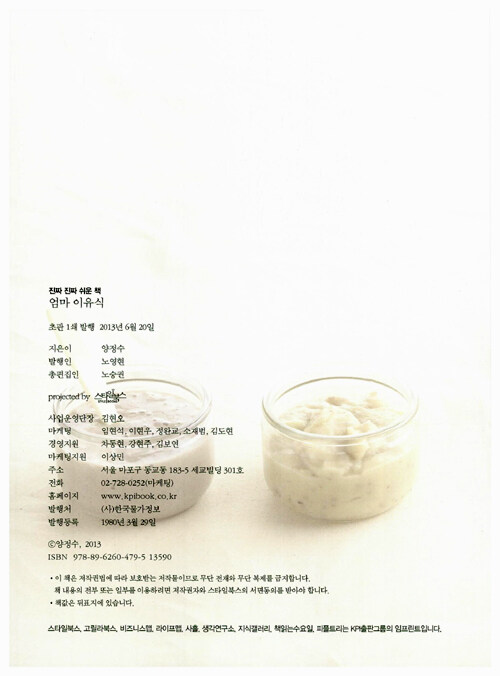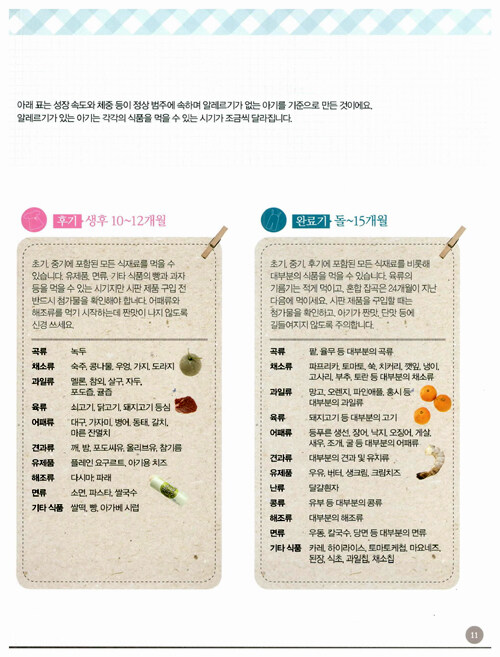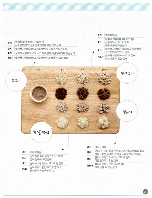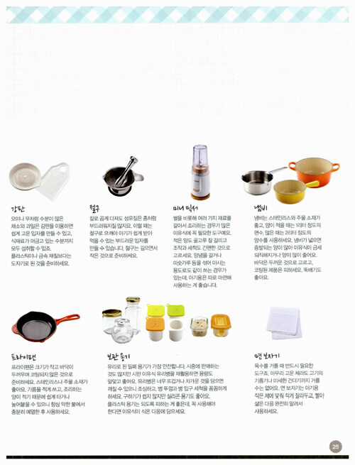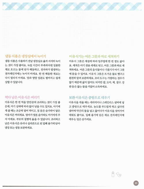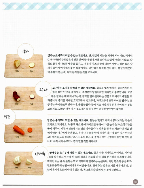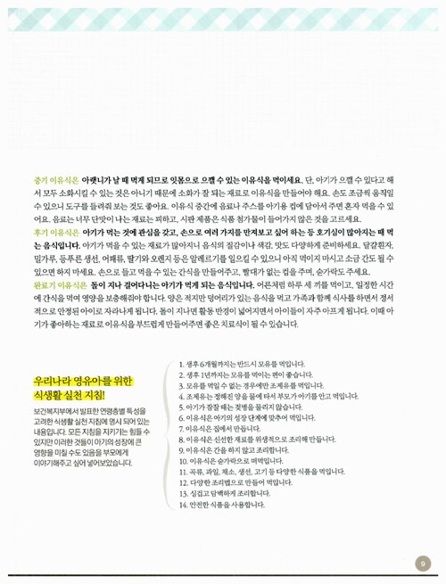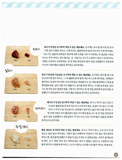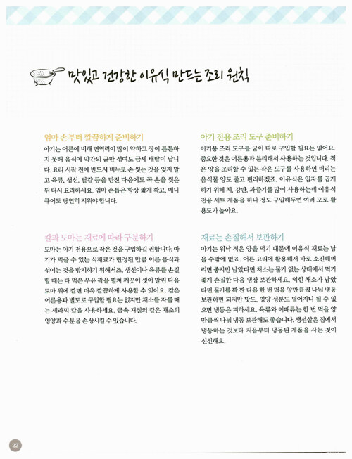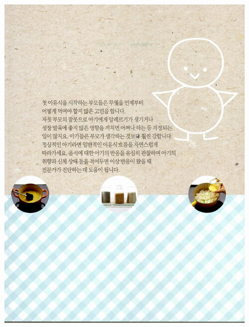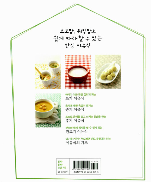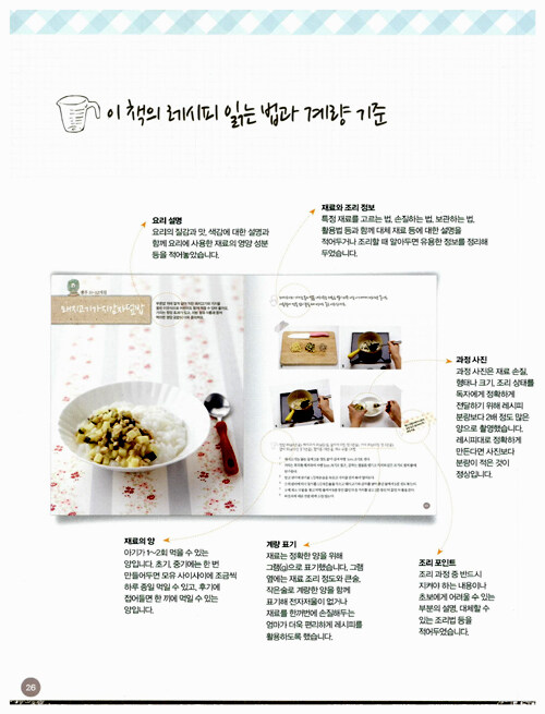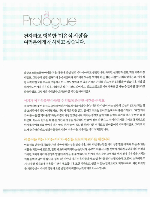 이유식의 개념과 이해, 먹이는 순서에 대한 꼼꼼한 조언이 책 속에 있다. 단계별로 아기가 먹을 수 있는 식재료를 한눈에 볼 수 있도록 정리한 내용과 일 년 내내 쉽게 구할 수 있는 참 좋은 이유식 재료가 보기 쉽게 정리되어 있다. 뿐만 아니라 단계별 이유식 식재료 농도와 크기, 건강한 이유식 만드는 조리 원칙, 이유식에 알맞은 조리 도구와 보관 용기, 이유식이 맛있어지는 육수와 천연 가루 만드는 법도 책 속에 빼곡하게 들어 있다.