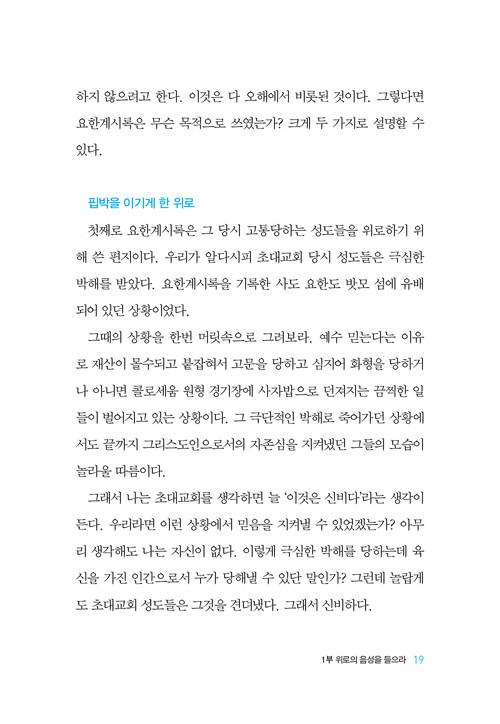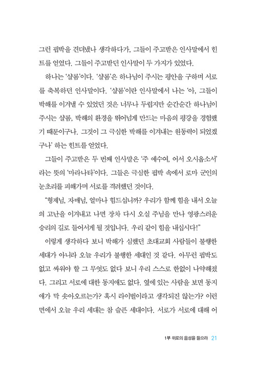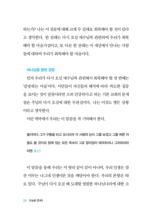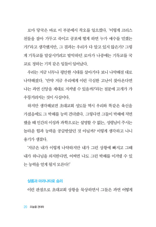 초대교회 성도들이 주님을 바라보고 다시 오실 주님을 소망하며 하루하루를 견뎌냈던 것처럼, 그래서 결국 주님이 주시는 최후 승리를 맛보았던 것처럼 우리도 주님을 바라보고 그 소망을 붙들 때 오늘을 힘 있게 견뎌낼 수 있다.