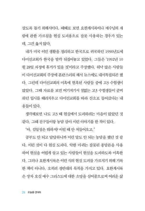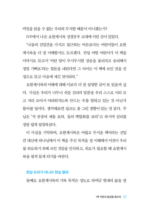 어렵고 힘든 마지막 때를 사는 힘, 요한계시록에서 얻어라! 요한계시록은 사실 로마의 극심한 핍박 가운데 고통을 겪던 초대교회 성도들을 위해 주신 하나님의 영적 인생 안내서다. 그렇기에 어려운 현실을 믿음으로 살아내는 주의 백성을 향한 하나님의 위로와 격려로 가득하다. 마지막 때를 살아가고 있는 오늘의 우리에게는 그 어느 때보다 이 말씀의 보화가 필요하다.