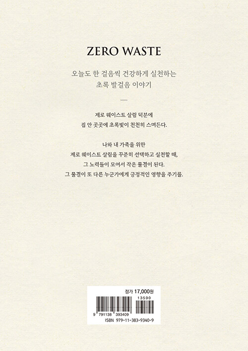 일상에서 쉽고 즐겁게 시도할 수 있는 건강한 제로 웨이스트 살림법을 알려 주는 책이다. 제로 웨이스트 살림 유튜버인 ‘어느덧오늘’ 저자는 완벽하지 않아도 조금씩 제로 웨이스트를 시도하고 실천하는 것이 중요하다고 이야기하며, 자신의 실제 경험과 노하우를 통해 집 안과 밖에서 매일 하나씩 실천할 수 있는 제로 웨이스트 살림법을 소개한다.