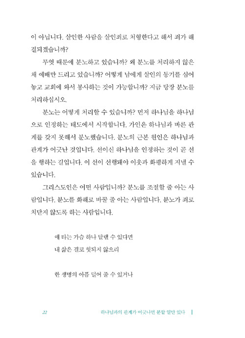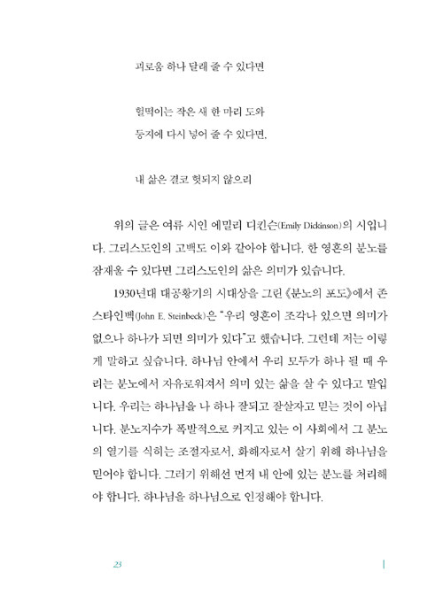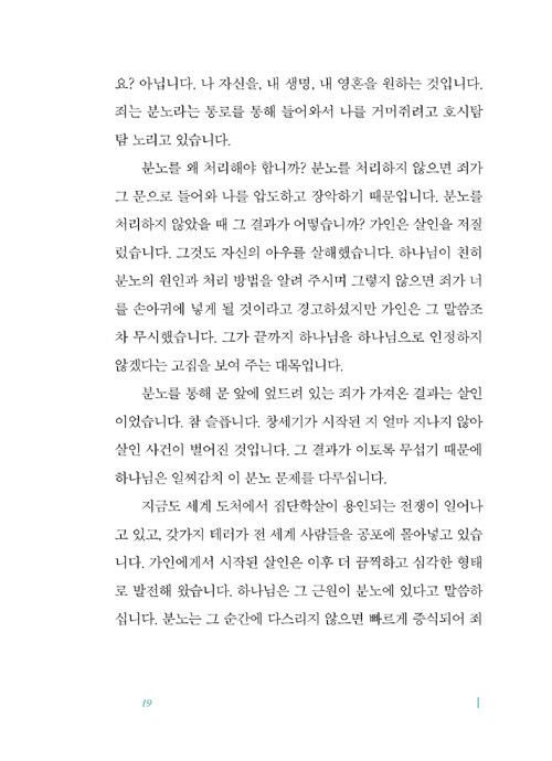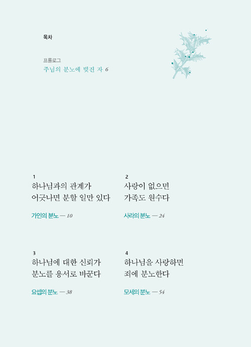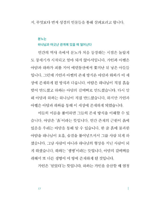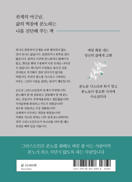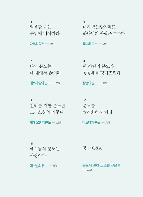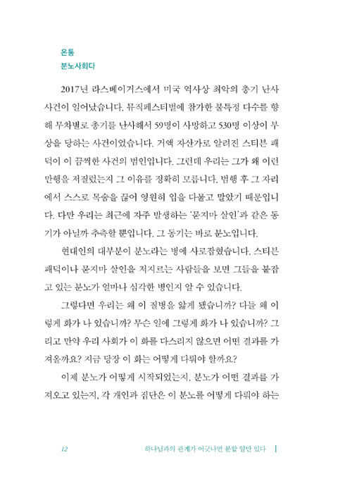 이 책은 우리 사회의 분노가 어디서 시작되었는지, 분노가 어떤 결과를 가져오고 있는지, 각 개인과 집단은 이 분노를 어떻게 다뤄야 하는지, 무엇보다 먼저 성경의 인물들을 통해 살펴보고 있다. 그리고 그 인물들을 통하여 우리 스스로 그 분노를 어떻게 다뤄야 할 지에 대한 해답을 찾는다.