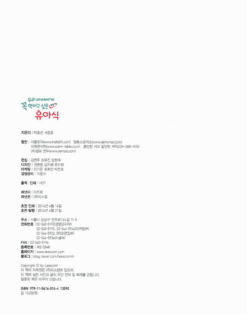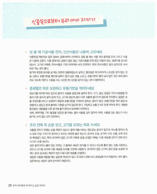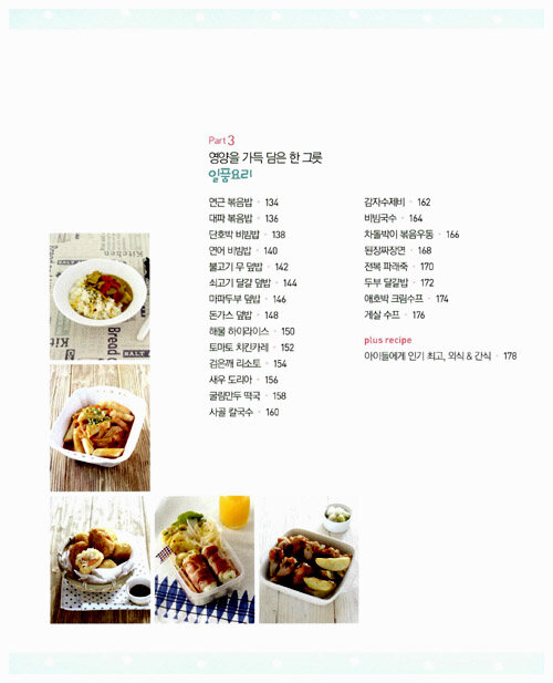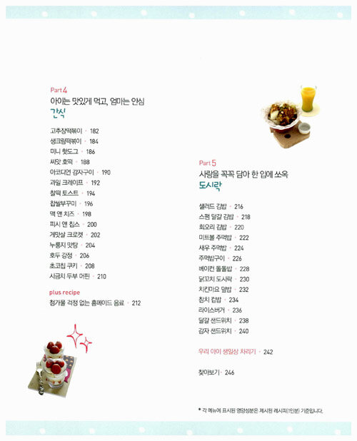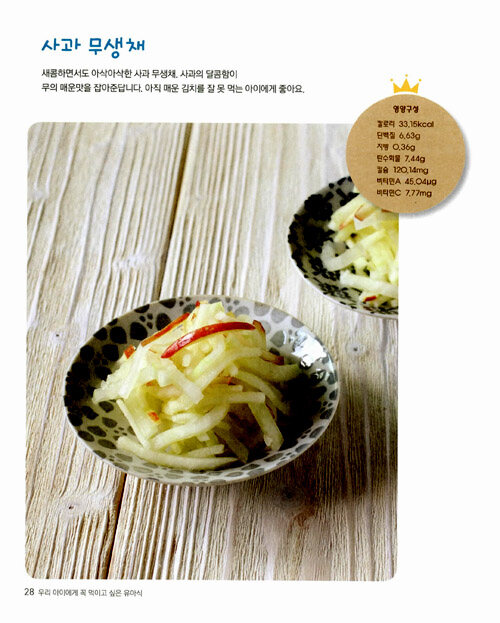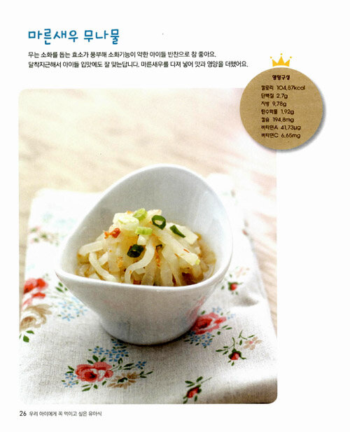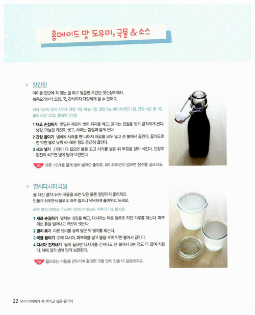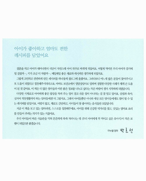 일상적으로 먹는 반찬, 국·찌개부터 간식, 도시락, 생일상까지 모든 메뉴를 담고, 메뉴마다 3대 필수영양소와 칼슘, 비타민 등의 함유량도 표시했다. 그간 좋은 밥상에 목말라했던 엄마들에게 딱 필요한 내용으로 가득 채웠다. 이 한 권의 책이면 아이는 잘 먹고, 엄마는 만족하는 기분 좋은 유아식을 만들 수 있을 것이다.
