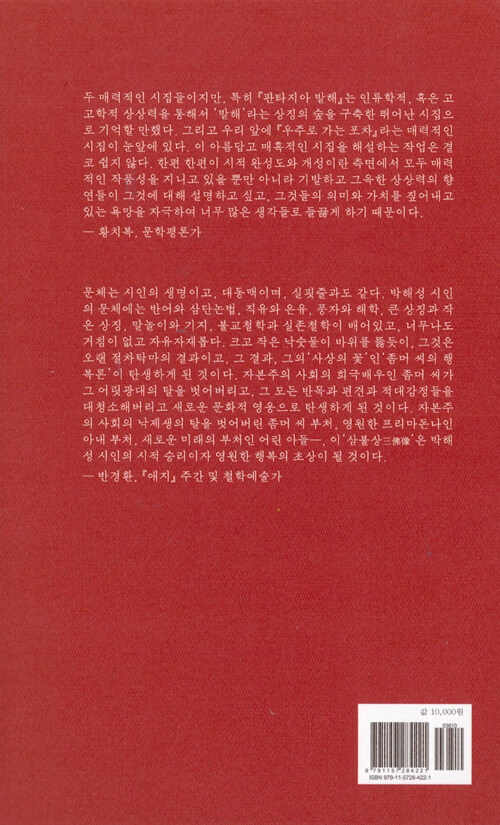 박해성 시인의 <우주로 가는 포차>는 과거와 환상의 내용물을 중첩시키기, 사이버 공간과 현실의 공존을 통한 대비효과를 증폭시키기, 현실의 특정한 국면을 선택하고 그것을 영원화하는 전략으로서의 카메라 렌즈를 통해서 세상 바라보기, 극지의 경험을 통해서 초월적 현실에 대한 비전을 제시하기, 일상적 현실에 신화적 세계를 중첩하기로 설명할 수 있다. 이러한 시적 전략들은 모두 놀라운 효과를 발휘하면서 우리를 ‘지금-여기’가 아니라 놀라운 환상의 세계, 혹은 신화의 세계로 초대한다.