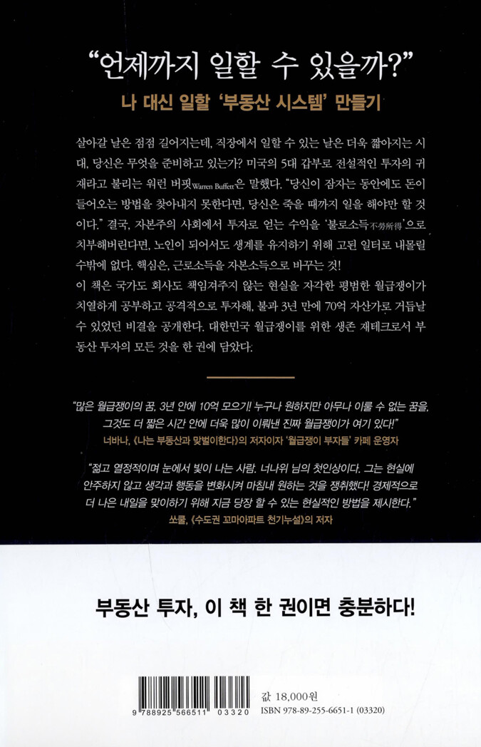 살아갈 날은 점점 길어지는데 직장에서 일할 수 있는 날은 더욱 짧아지는 시대, 당신은 무엇을 준비하고 있는가? 이 책은 국가도 회사도 책임져주지 않는 현실을 자각한 평범한 월급쟁이가 치열하게 공부하고 공격적으로 투자해, 100억 자산가로 거듭날 수 있었던 ‘부동산 투자’ 비결을 공개한다.