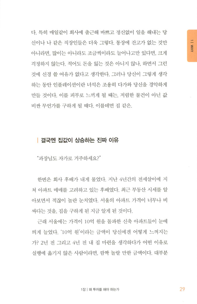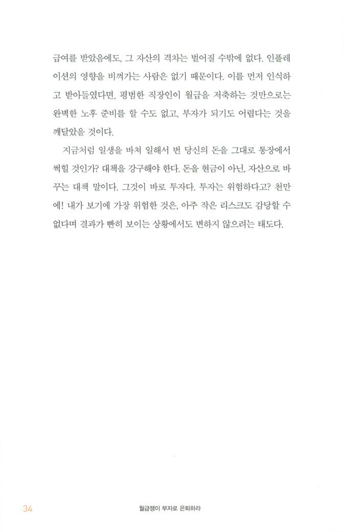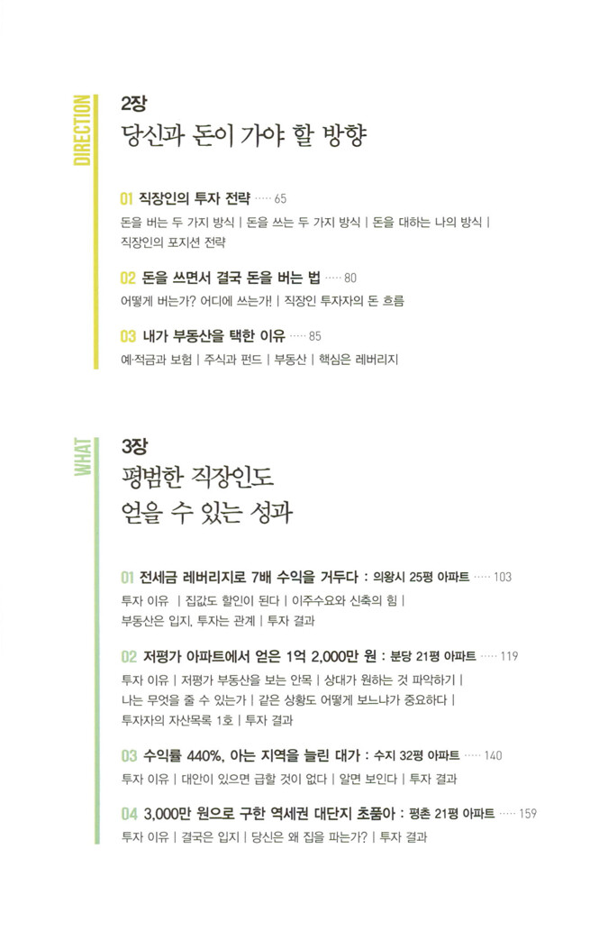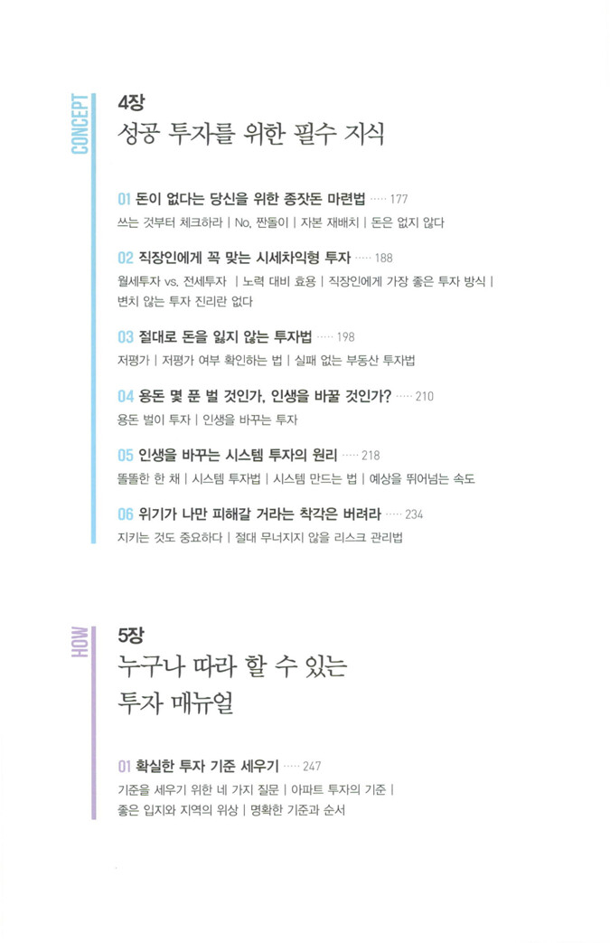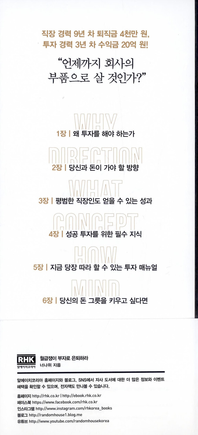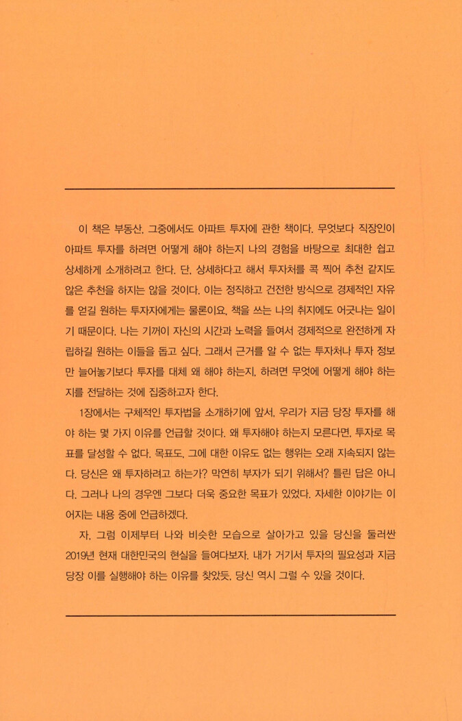 자본주의 사회에서 투자로 얻는 수익을 ‘불로소득(不勞所得)’으로만 치부해 버린다면, 노인이 되어서도 생계를 위해 고된 일터로 내몰릴 수밖에 없다. 핵심은, 근로소득을 자본소득으로 바꾸어, 나 대신 일할 ‘시스템’을 마련하는 것! 이 책은 투자를 왜 해야 하는지, 평범한 직장인이 어떤 방향과 목표를 세우고 수입과 지출을 관리해야 하는지 알려주는 동시에 지금 당장 따라 할 수 있는 투자 매뉴얼을 통해, 현시점 누구라도 부동산 투자로 미래와 노후를 준비할 수 있게 돕는다.
